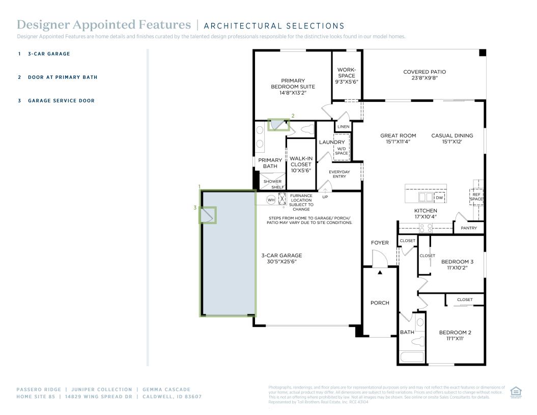 Discover the exquisite Gemma home design, offering a perfect blend of luxury and functionality. This single-family residence boasts an open floor plan that creates a seamless flow throughout. As soon as guests enter through the welcoming foyer, they are greeted by the spacious great room. Entertaining is made easy with the adjacent casual dining area that opens up to a covered patio, ideal for indoor-outdoor living. As well as a well-appointed kitchen. Retreat to the private primary suite, complete with a luxurious shower in the primary bath and a separate private water closet. Two additional bedrooms provide ample space for family or guests, while the laundry room adds practicality to everyday life.
