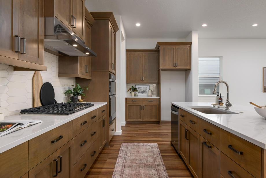 Chef inspired kitchens with gas range, large center island, and abundant cabinet space