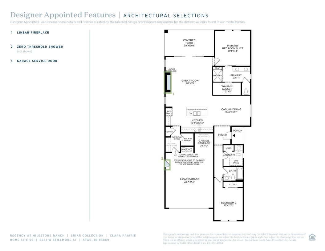 The beautifully designed Clara features an alluring blend of luxury and charm. A bright foyer opens immediately onto the casual dining area and great room that provides views of the desirable rear covered patio. The well-appointed kitchen is complete with an oversized center island with breakfast bar, plenty of counter and cabinet space, and a roomy walk-in pantry. Secluded off the great room, the marvelous primary bedroom suite is defined by an ample walk-in closet and an alluring primary bath with dual-sink vanity, a large luxe shower with seat, and a private water closet. The secondary bedroom can be found off the foyer and features a sizable closet and a shared hall bath. The Clara is additionally highlighted by easily accessible laundry, an everyday entry, and additional storage throughout.