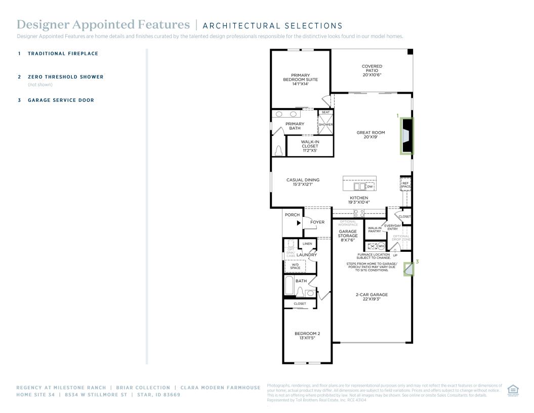 The beautifully designed Clara features an alluring blend of luxury and charm. A bright foyer opens immediately onto the casual dining area and great room that provides views of the desirable rear covered patio. The well-appointed kitchen is complete with an oversized center island with breakfast bar, plenty of counter and cabinet space, and a roomy walk-in pantry. Secluded off the great room, the marvelous primary bedroom suite is defined by an ample walk-in closet and an alluring primary bath with dual-sink vanity, a large luxe shower with seat, and a private water closet. The secondary bedroom can be found off the foyer and features a sizable closet and a shared hall bath. The Clara is additionally highlighted by easily accessible laundry, an everyday entry, and additional storage throughout.