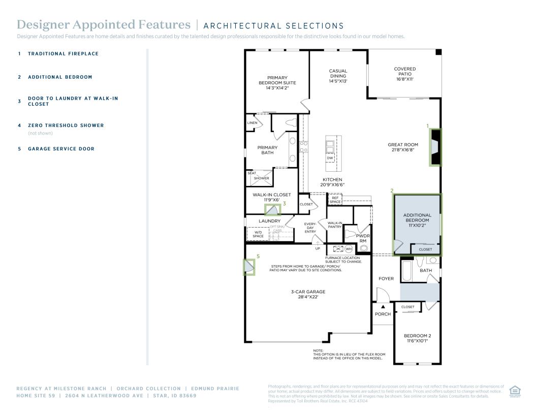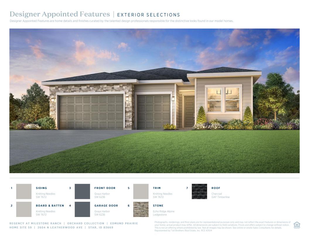 The Edmund is a sophisticated single-story home design. A welcoming foyer sweeps past a versatile flex room into an airy great room bathed in light from the covered patio beyond. Adjacent to a charming casual dining area, the well-appointed kitchen features a walk-in pantry, generous counter and cabinet space, and a center island with breakfast bar perfect for meal preparation and casual gatherings. The stylish primary bedroom boasts a large walk-in closet and a serene bathroom with a dual-sink vanity, a luxurious shower with seat, linen storage, and a private water closet. A lovely secondary bedroom offers an ample closet and a private bath. Other highlights include a convenient laundry room off the everyday entry, a powder room, and extra storage throughout.