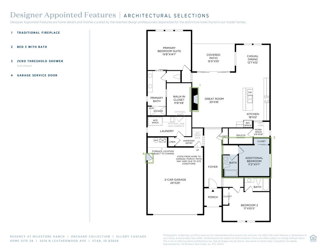 The Ellory seamlessly blends charm and elegance within a beautifully designed floor plan. An extended foyer hallway flows past a spacious flex room, revealing the expansive great room and a gorgeous covered patio. A bright casual dining area can be found adjacent to the well-appointed kitchen that offers an oversized center island with breakfast bar, plenty of counter and cabinet space, a roomy workspace, and a sizable walk-in pantry. The superb primary bedroom suite is defined by a stunning walk-in closet and a spa-like primary bath with dual-sink vanity, a large luxe shower with seat, and a private water closet. The secondary bedroom is secluded off the foyer and features a roomy closet as well as a private bath. Easily accessible laundry, an everyday entry, a powder room, and ample additional storage are additional features of the Ellory.