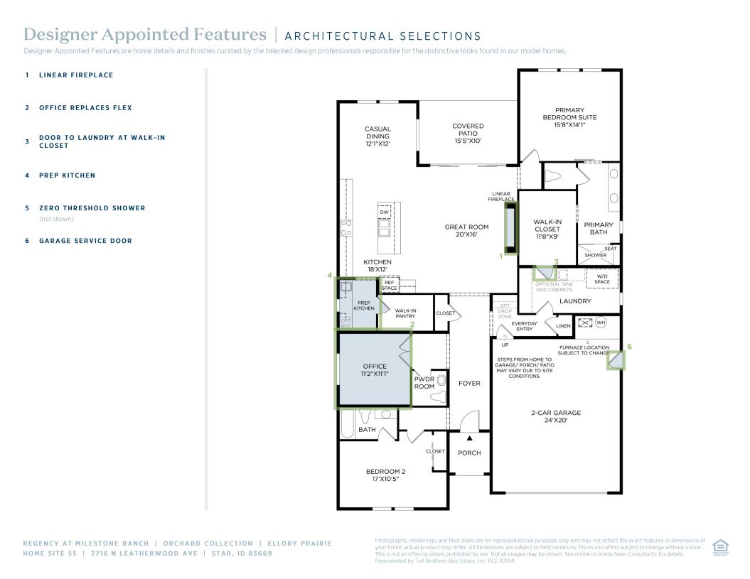 The Ellory seamlessly blends charm and elegance within a beautifully designed floor plan. An extended foyer hallway flows past a spacious flex room, revealing the expansive great room and a gorgeous covered patio. A bright casual dining area can be found adjacent to the well-appointed kitchen that offers an oversized center island with breakfast bar, plenty of counter and cabinet space, a roomy workspace, and a sizable walk-in pantry. The superb primary bedroom suite is defined by a stunning walk-in closet and a spa-like primary bath with dual-sink vanity, a large luxe shower with seat, and a private water closet. The secondary bedroom is secluded off the foyer and features a roomy closet as well as a private bath. Easily accessible laundry, an everyday entry, a powder room, and ample additional storage are additional features of the Ellory.