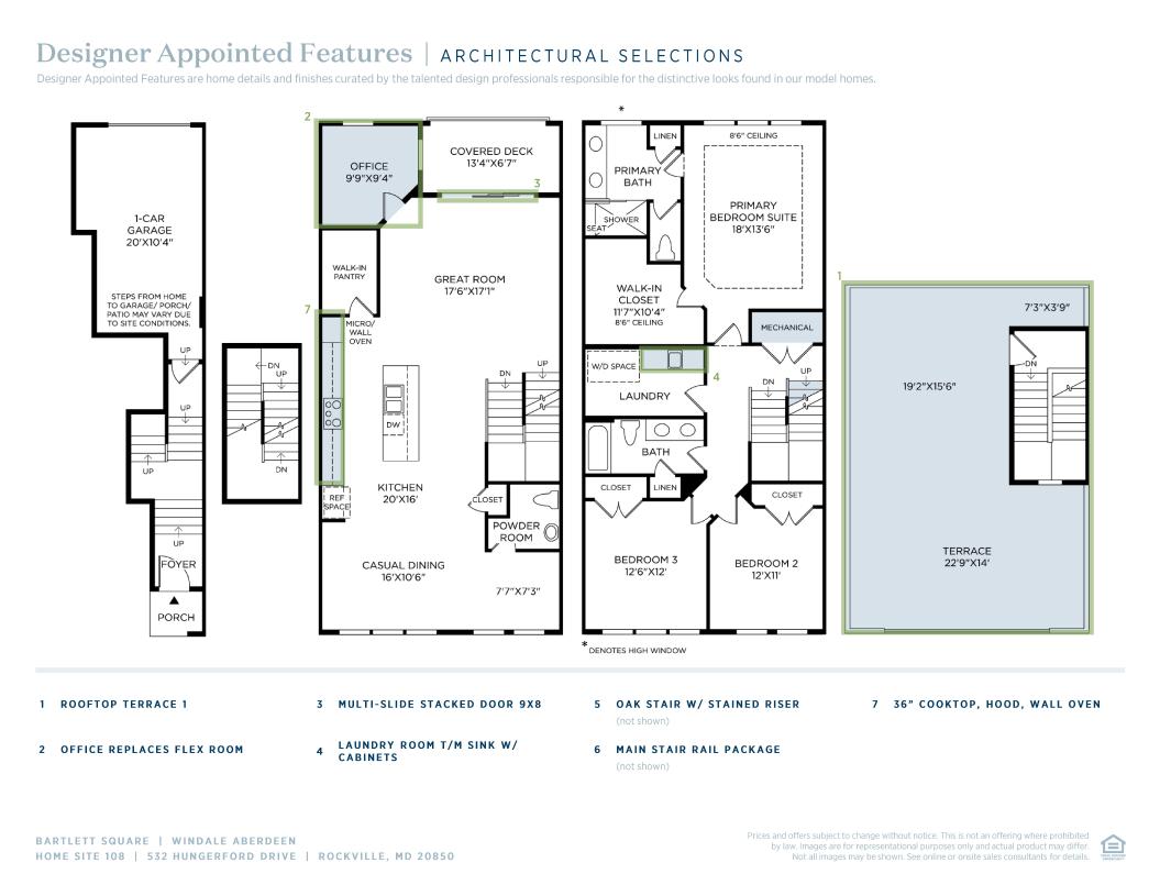 The Windale offers elevated living across multiple levels with thoughtful spaces designed for both comfort and versatility. A comforting foyer brings you to the third floor and welcomes you with an open-concept layout that includes a cozy great room, well-appointed kitchen with a center island and walk-in pantry, and a casual dining area. A powder room adds convenience, while a nearby flex room and a covered deck extend the living and entertaining space. Upstairs on the fourth floor, the private primary suite features a walk-in closet and a luxe bath with dual-sink vanity, shower with seat, linen closet, and private water closet. Two secondary bedrooms share a hall bath, and a centrally located laundry room provides added convenience. The fifth floor completes the design with both finished and unfinished terrace spaces—ideal for outdoor living or future customization.