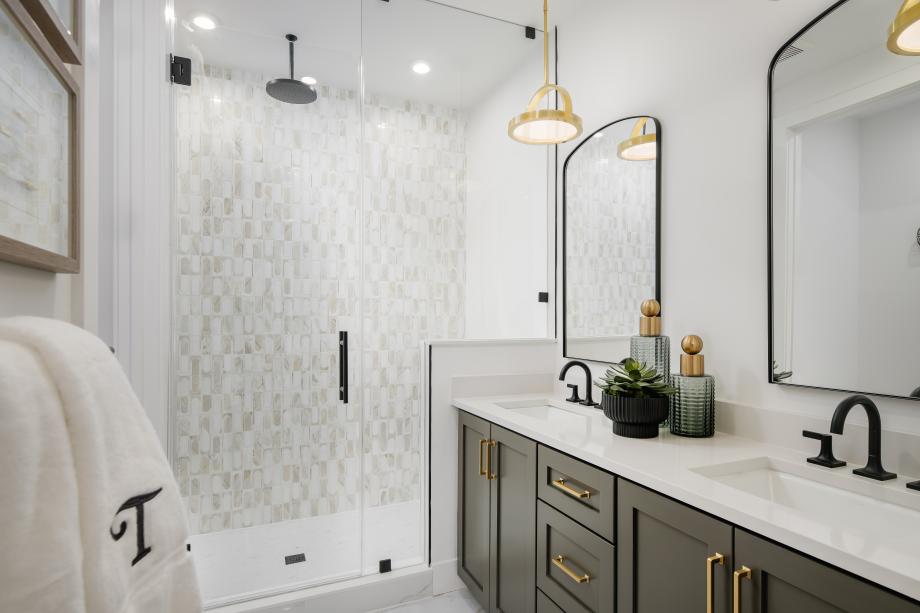 Luxurious primary bathrooms with dual sink vanities