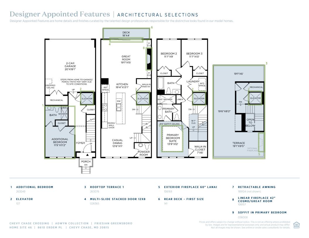 This homes welcoming foyer leads to a first-floor bedroom, offering flexible options for guests, a home office, or personal retreat. The second level presents an open-concept living area, where the spacious great room seamlessly transitions into the kitchen and casual dining space. This home features a deck off the main level, complete with a stacking slider door that enhances both style and functionality. The chef-inspired kitchen is designed for convenience and elegance, featuring an expansive center island with abundant counter and cabinet space, and a convenient walk-in pantry. The great room, with its cozy fireplace, provides the perfect spot to relax and unwind. On the third floor, the serene primary suite is a true retreat, boasting a tray ceiling that adds dimension and elegance, a spacious walk-in closet, and a luxurious bathroom with a dual-sink vanity, large shower with a seat, and a private water closet. Two charming secondary bedrooms are conveniently located near a full hall bath. The fourth-floor rooftop terrace is the perfect place to unwind, featuring a cozy outdoor fireplace and an awning that ensures comfort all year round while providing stunning views of the community. Additional features include oak stained staircases throughout and iron balusters.