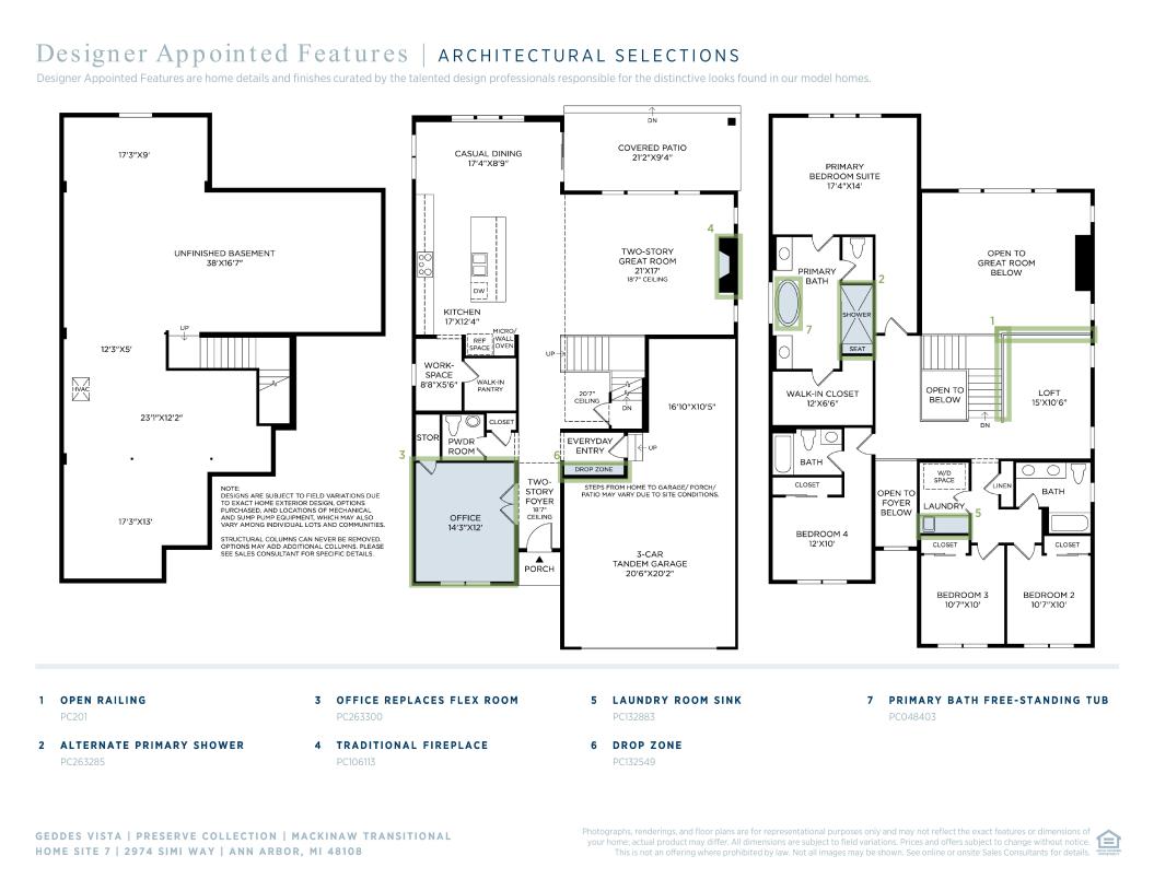 The Mackinaw offers an impressive layout that blends beauty with everyday comfort. A grand two-story foyer sets the stage, leading into a spacious kitchen with a center island, walk-in pantry, and adjacent workspace designed for productivity. The open-concept kitchen flows into the casual dining area and a soaring two-story great room, creating a stunning setting for entertaining. Sliding doors lead to a covered patio, perfect for fresh-air gatherings. A nearby powder room and a versatile flex room enhance the main level’s functionality. Upstairs, the primary suite features a generous walk-in closet and a luxe bath with dual vanities, a shower with seat, and a private water closet. Three secondary bedrooms, one with a private bath and two sharing a full hall bath, offer comfort for family or guests. A central loft overlooks the great room and provides additional space for relaxing or entertaining. A conveniently located laundry room adds ease to everyday living.
