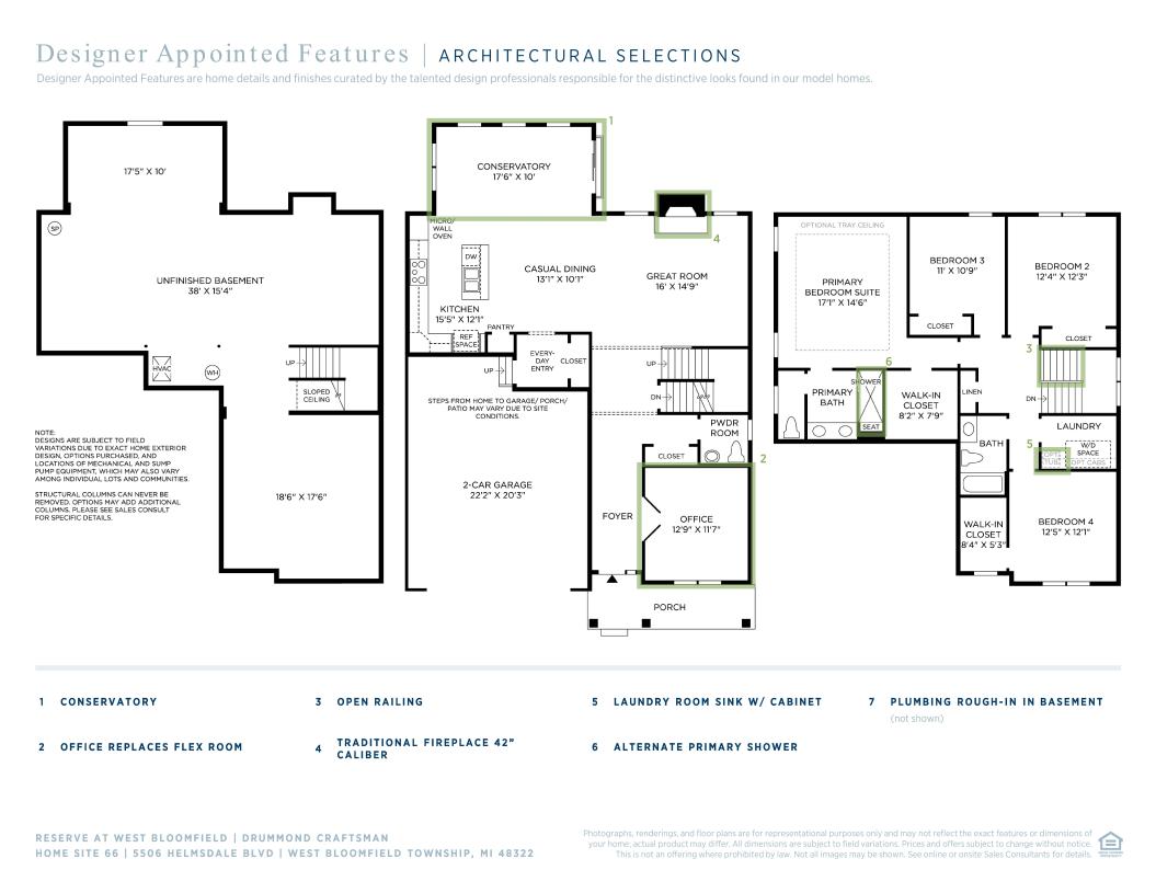 The Drummond's spacious foyer and flex room open onto the charming great room and casual dining area with desirable access to the rear yard—perfect for entertaining. Adjacent, the well-appointed kitchen offers a large center island with breakfast bar, wraparound counter and cabinet space, and a roomy pantry. Defining the alluring primary bedroom suite are a generous walk-in closet and a luxurious primary bath with a dual-sink vanity, a large luxe shower with seat, and a private water closet. Secondary bedrooms, one with walk-in closet, two with sizable closets, share a hall bath. Additional highlights include easily accessible second-floor laundry, a powder room, an everyday entry, and additional storage throughout.