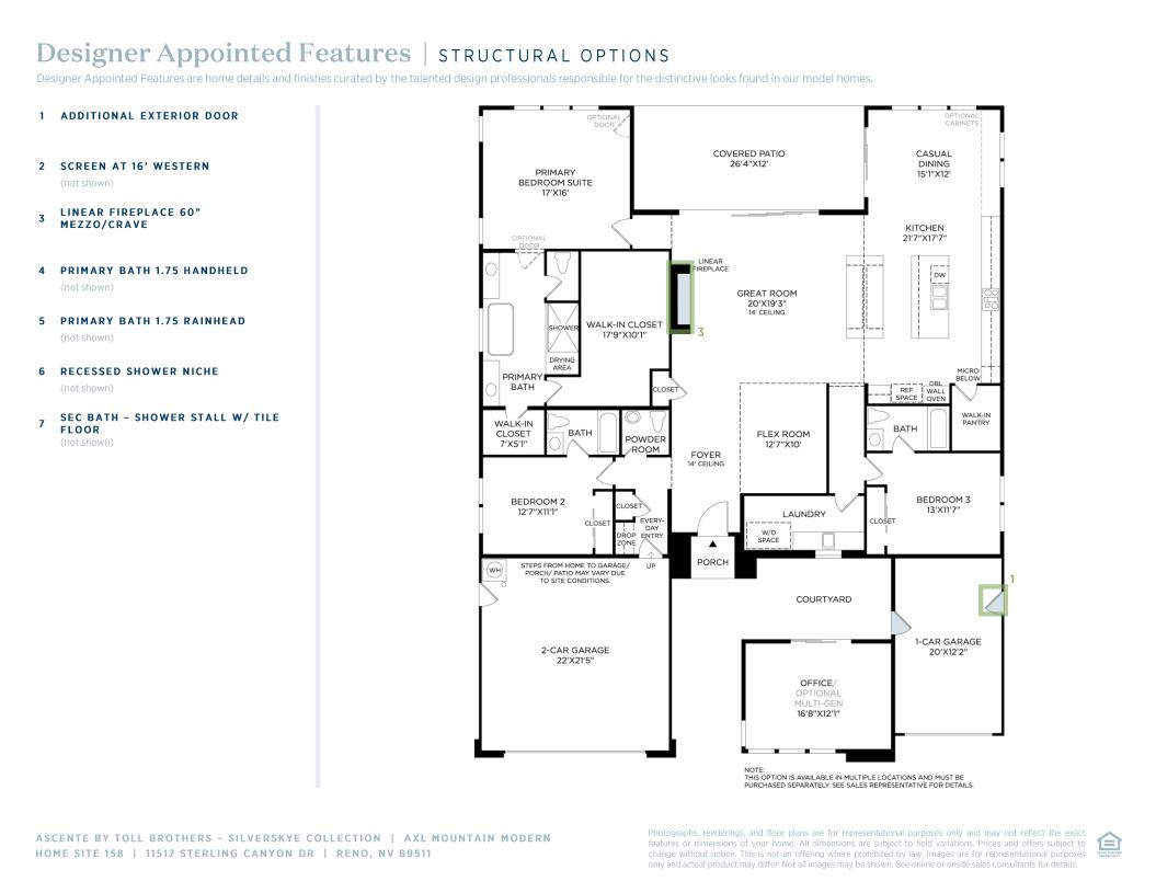 The Axl offers a thoughtfully designed layout that seamlessly blends comfort and style. A front courtyard and foyer make an immediate impression, presenting views of the open-concept main living area. The heart of the home features a spacious great room that provides direct access to a beautiful outdoor covered patio. Overlooking a casual dining area, the gourmet kitchen is well-equipped with dual islands, plenty of counter and cabinet space, and a walk-in pantry. A flex room and dedicated office located off the courtyard provide versatile spaces for work or leisure. the elegant primary bedroom suite features dual walk-in closets and a luxurious private bath with dual vanities separated by a freestanding tub, a spa-like shower with a drying area, and a private water closet. Two secondary bedrooms, each with private baths, offer ample space for family and guests. Additional features include easily accessible laundry, a convenient everyday entry with drop zone, and a powder room.