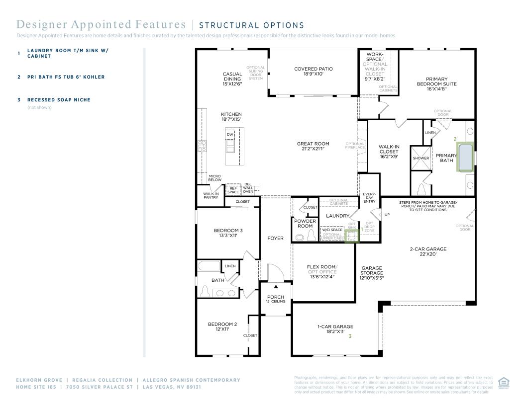 The Allegro showcases an impressively modern floorplan with an expansive great room that overlooks the beautiful foyer and spacious rear covered patio. Complemented by an airy casual dining area, the exceptionally designed kitchen is central to the great room, highlighted by large center island with breakfast bar, plenty of counter and cabinet space, and a sizable walk-in pantry. A generous walk-in closet enhances the palatial primary bedroom suite, complete with a stunning primary bath with a spa-like shower, dual vanities, linen storage, and a private water closet. Found off the foyer, secondary bedrooms offer roomy closets and share a hall bath with dual-sink vanity and linen storage. The Allegro also features a versatile flex room as well as a thoughtful workspace conveniently located off the great room with additional highlights including a powder room and everyday entry, easily accessible laundry, and plenty of storage throughout.