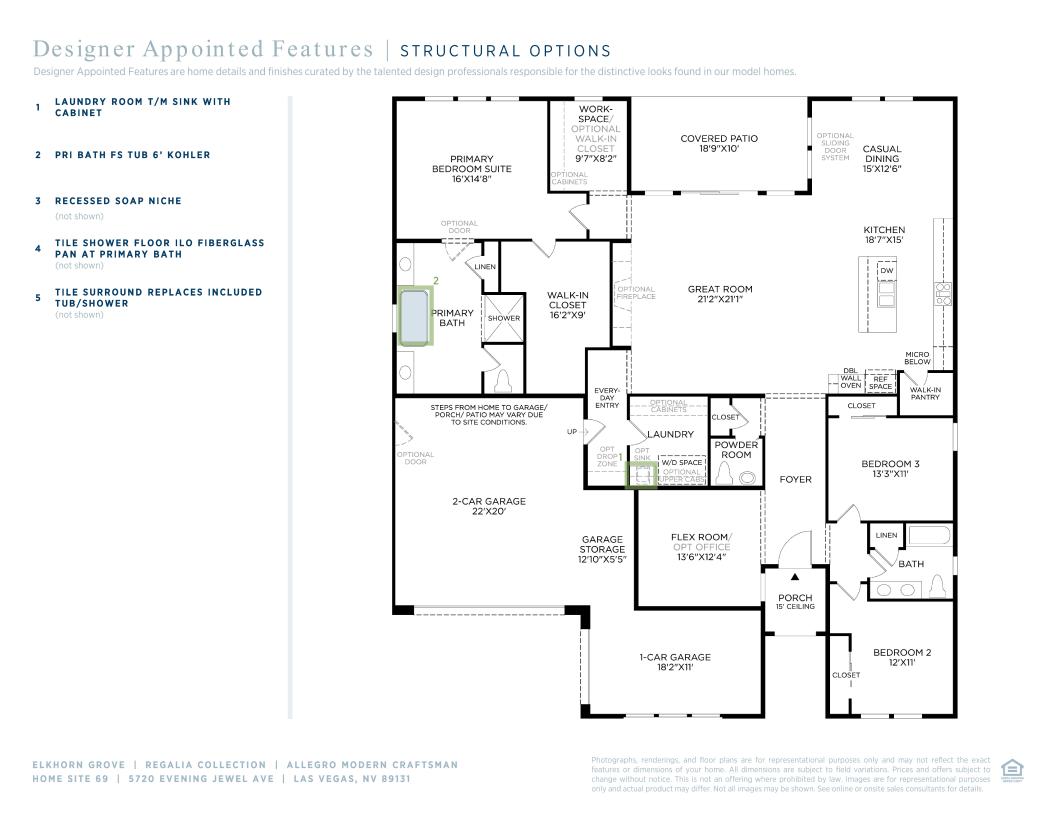 The Allegro showcases an impressively modern floorplan with an expansive great room that overlooks the beautiful foyer and spacious rear covered patio. Complemented by an airy casual dining area, the exceptionally designed kitchen is central to the great room, highlighted by large center island with breakfast bar, plenty of counter and cabinet space, and a sizable walk-in pantry. A generous walk-in closet enhances the palatial primary bedroom suite, complete with a stunning primary bath with a spa-like shower, dual vanities, linen storage, and a private water closet. Found off the foyer, secondary bedrooms offer roomy closets and share a hall bath with dual-sink vanity and linen storage. The Allegro also features a versatile flex room as well as a thoughtful workspace conveniently located off the great room with additional highlights including a powder room and everyday entry, easily accessible laundry, and plenty of storage throughout.