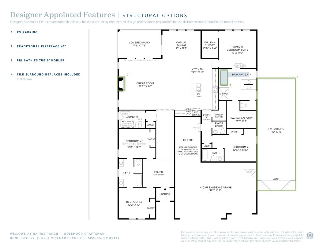 The single-story Rosemoor’s beauty begins with a grand 12-foot ceiling foyer that flows into a stunning great room and casual dining area with a covered patio. Adjacent, the well-appointed kitchen is highlighted by a large center island, plenty of counter and cabinet space, and a sizable walk-in pantry. Enhancing the allure of the spacious primary bedroom suite are two generous walk-in closets and an appealing primary bath with a large luxe shower, a double-sided dual-sink vanity, and a private water closet. One secondary bedroom features a private full bath, and the other two have a shared bath with dual vanities and a private water closet. Additional highlights include a convenient powder room, centrally located laundry, 10' ceilings, a 4-car tandem garage with side entry, and plenty of additional storage throughout.