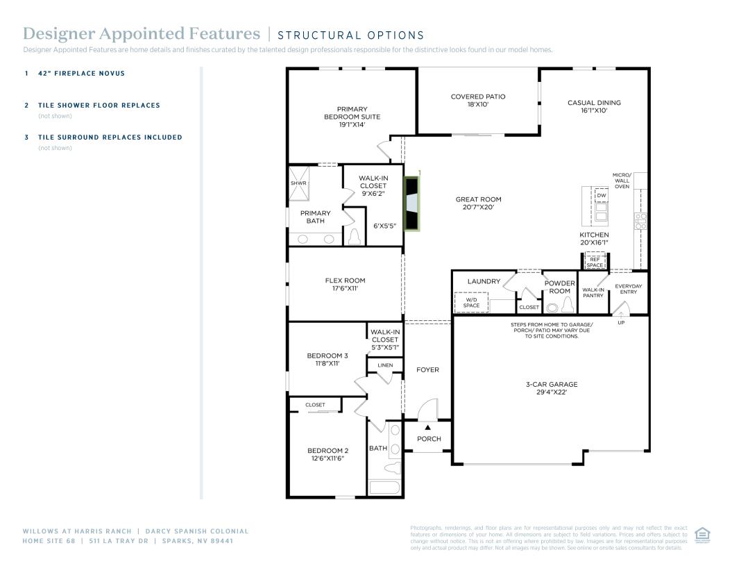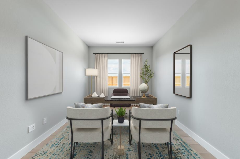 The Darcy home design blends style with everyday function in a refined single-story floor plan. From the welcoming foyer, an open main living area connects the kitchen, casual dining space, and great room—ideal for relaxed living and entertaining. Designed for convenience, the kitchen features a center island, a walk-in pantry, and ample counter and cabinet space. The great room opens to a covered patio, perfect for indoor-outdoor living. The primary bedroom includes a generous walk-in closet and a spa-like bath with a dual-sink vanity, a luxe shower, and a private water closet. Two secondary bedrooms share a full hall bath with a dual-sink vanity, providing comfort for guests or family. A versatile flex room near the entry provides space for work or relaxation. Additional highlights include a centrally located laundry room, an everyday entry, and a convenient powder room.