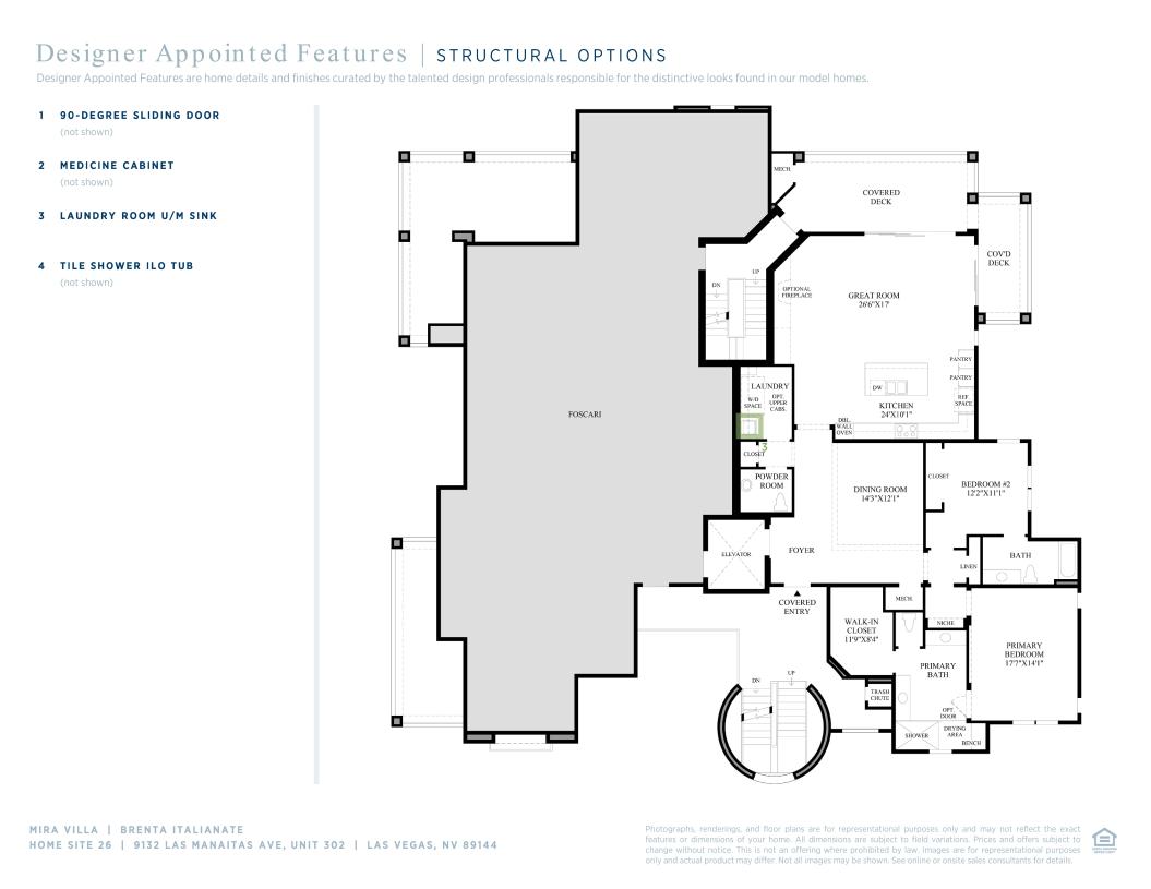The Brenta features modern archecture that perfectly suits an elevated lifestyle. The inviting foyer is enhanced by elegant stairs, opening onto a formal dining room that presents alluring views of the spacious great room and wraparound covered deck beyond. The well-designed kitchen is equipped with a large center island with breakfast bar, plenty of counter and cabinet space, and ample dual pantries. The serene primary bedroom suite is defined by a sizable walk-in closet and a deluxe primary bath complete with dual vanities, a luxe shower with seat and drying area, and a private water closet. The spacious secondary bedroom features a roomy closet and private full bath, with additional highlights of the Brenta including a convenient elevator, a powder room, easily accessible laundry, and additional storage throughout.