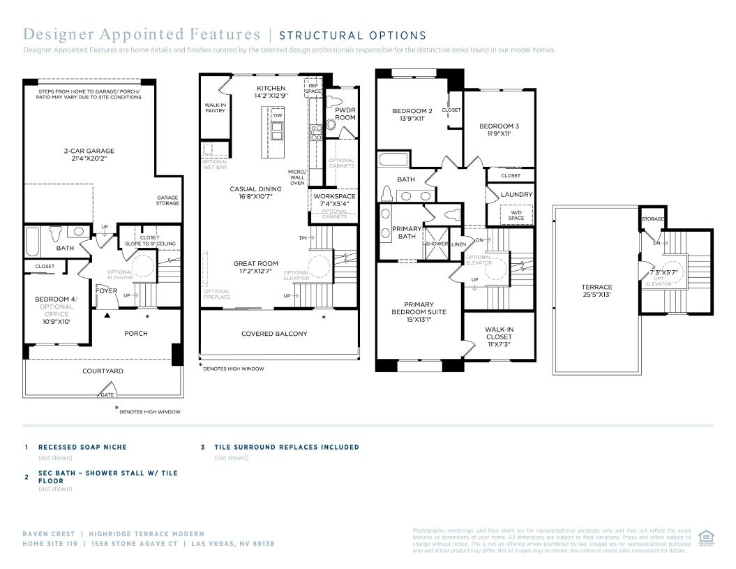 The Highridge Terrace offers a spacious open floor plan that is perfect for entertaining and everyday living. Enter into the welcoming foyer that leads to a convenient, first level secondary bedroom and stairs to the main living area. The main living level features an impressive great room with access to a lovely covered balcony, a casual dining area, and a well-designed kitchen with a large center island, a walk-in pantry, and plentiful cabinet and counter space. On the third floor, relax in the elegant primary bedroom complete a spacious walk-in closet and a charming bath with a dual-sink vanity, a luxurious shower, and a private water closet. Two secondary bedrooms each feature ample closet space and share a full hall bath with a dual-sink vanity. On the fourth floor is an exquisite rooftop terrace, perfect for entertaining and taking in the view. Additional desirable features include a versatile workspace off the kitchen, convenient powder room, and centrally located laundry on bedroom level.