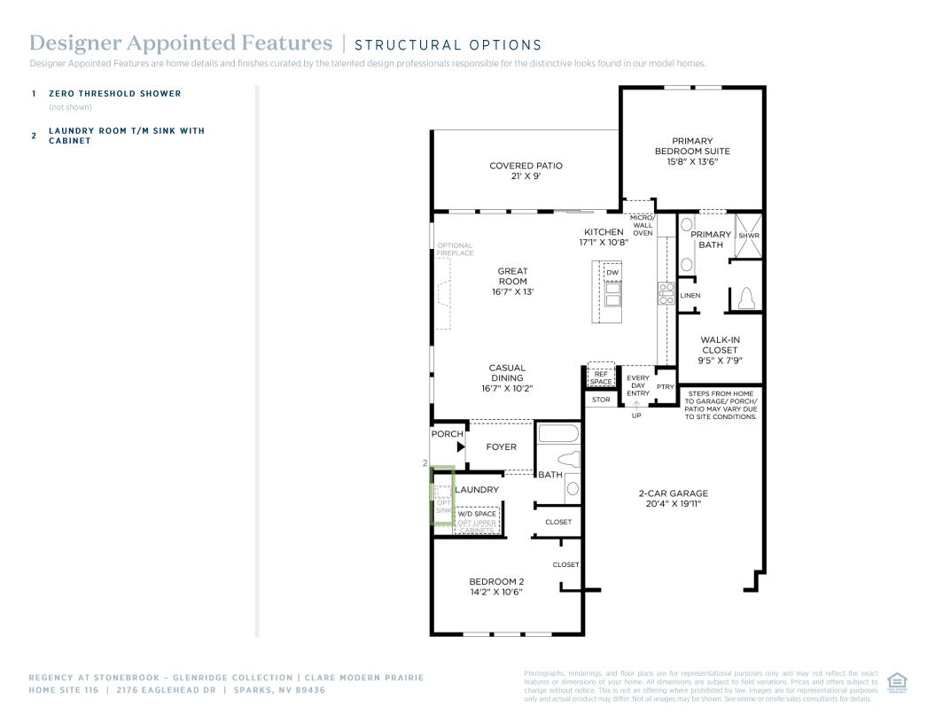 The Clare's lovely side porch and foyer open onto the expansive great room and casual dining area, with views to the desirable covered patio beyond. The well-appointed kitchen is highlighted by a large center island with breakfast bar, plenty of counter and cabinet space, and ample pantry. The marvelous primary bedroom suite is complete with a roomy walk-in closet and serene primary bath with dual-sink vanity, luxe shower, linen storage, and private water closet. The secondary bedroom features a sizable closet and shared hall bath. Additional highlights include centrally located laundry and additional storage.