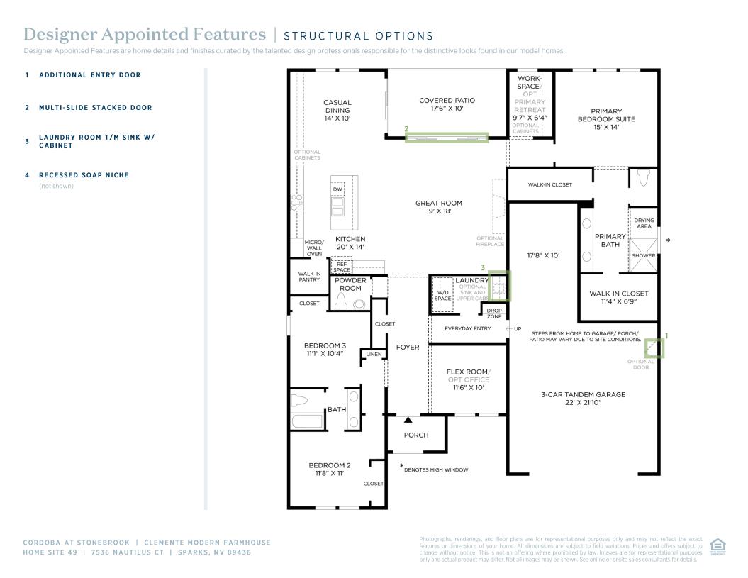 Beautifully designed for every moment, the Clemente opens with a beautiful foyer hallway flowing past a spacious flex room and into the expansive great room with views to the large rear covered patio. The well-designed kitchen overlooks a sizable casual dining area, and is complete with a large center island with breakfast bar, plenty of counter and cabinet space, and ample walk-in pantry. Defining the alluring primary bedroom suite are dual walk-in closets and a charming primary bath with dual-sink vanity, a large luxe shower with drying area, and a private water closet. The generous secondary bedrooms feature roomy closets and shared bath with separate dual-sink vanity area. Additional highlights include a convenient workspace off the great room, a powder room, an everyday entry, an easily-accessible laundry, and ample additional storage.