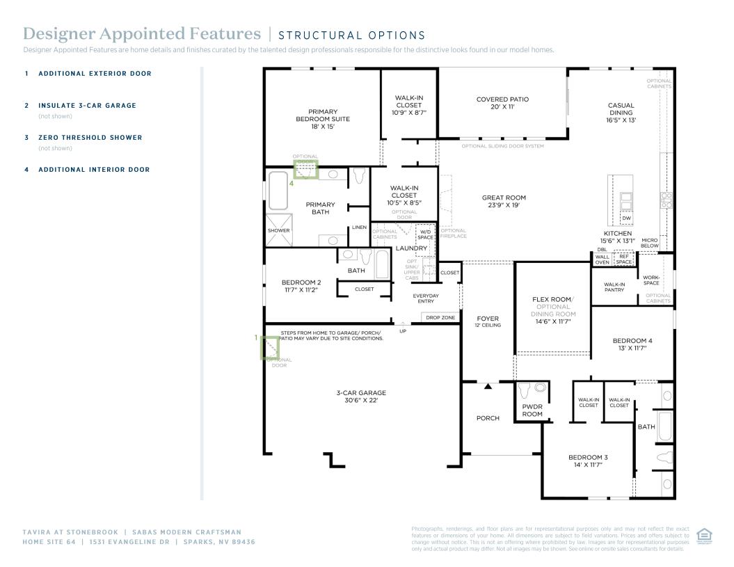 Perfectly designed to enhance the everyday, the Sabas features a gorgeous great room central to the airy foyer, bright casual dining area, and spacious covered patio. The well-appointed kitchen offers a large center island with breakfast bar, plenty of counter and cabinet space, a roomy walk-in pantry, and a convenient workspace. The magnificent primary bedroom suite is highlighted by dual walk-in closets and a marvelous primary bath with dual vanities, a large soaking tub, a luxe shower, linen storage, and a private water closet. Secondary bedrooms, one with a private bath, two with a shared bath with separate vanity areas, feature walk-in closets. Additional highlights include a secluded flex room, a powder room, an everyday entry with drop zone, a centrally located laundry, and plenty of additional storage.