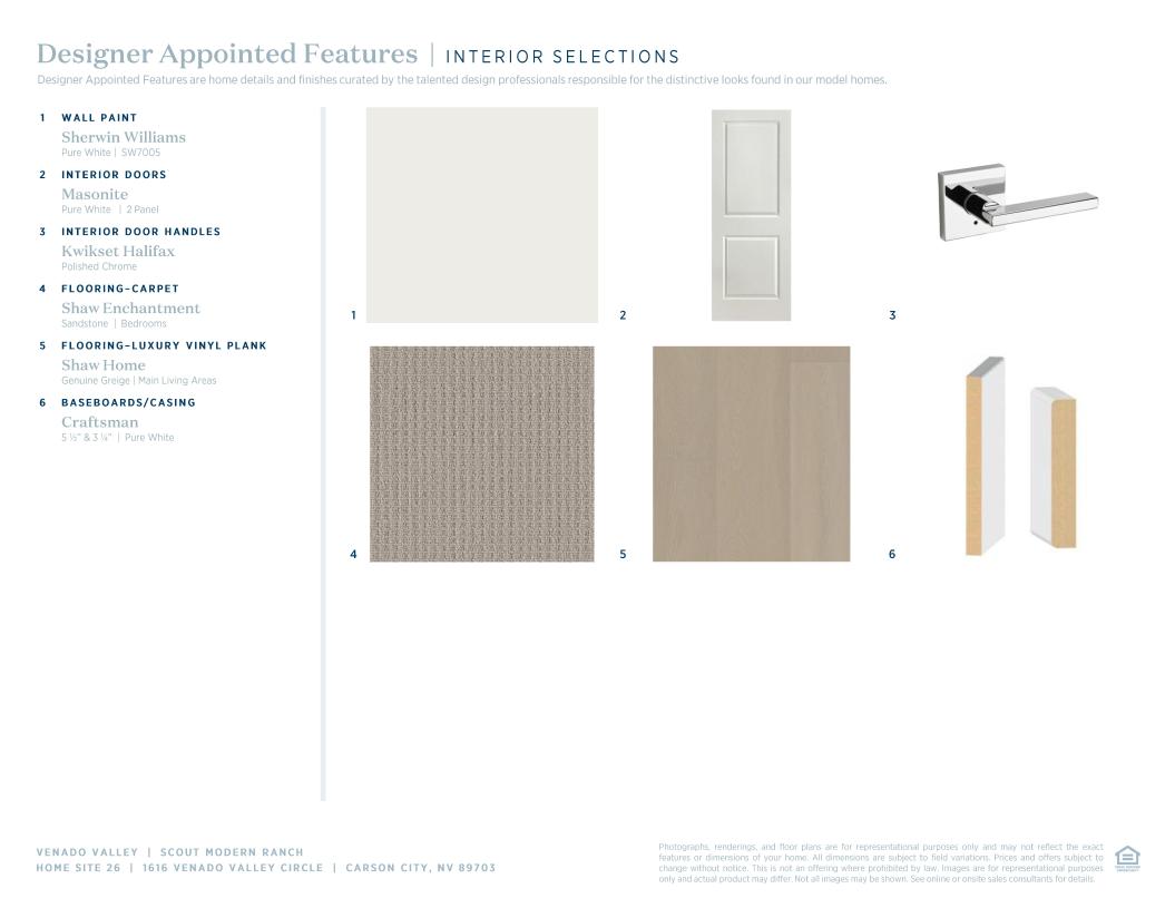 The Scout offers sophisticated living spaces within a seamless floor plan. As you step into the welcoming foyer, you are immediately presented with views of the spacious great room, where multi-slide stacked doors open to the outdoor living area, creating a seamless connection between indoor comforts and open-air enjoyment. Overlooking a casual dining area, the kitchen is a chef’s dream, featuring a center island with breakfast bar ample counter and cabinet space and a generous walk-in pantry. Tucked away off the main living area, the elegant primary suite includes a spacious walk-in closet and a beautiful private bath with dual vanities, a luxe shower, and a private water closet. Secondary bedrooms are thoughtfully placed in the front of the home and feature plenty of closet space. A convenient everyday entry and centrally located laundry are also featured in the home.