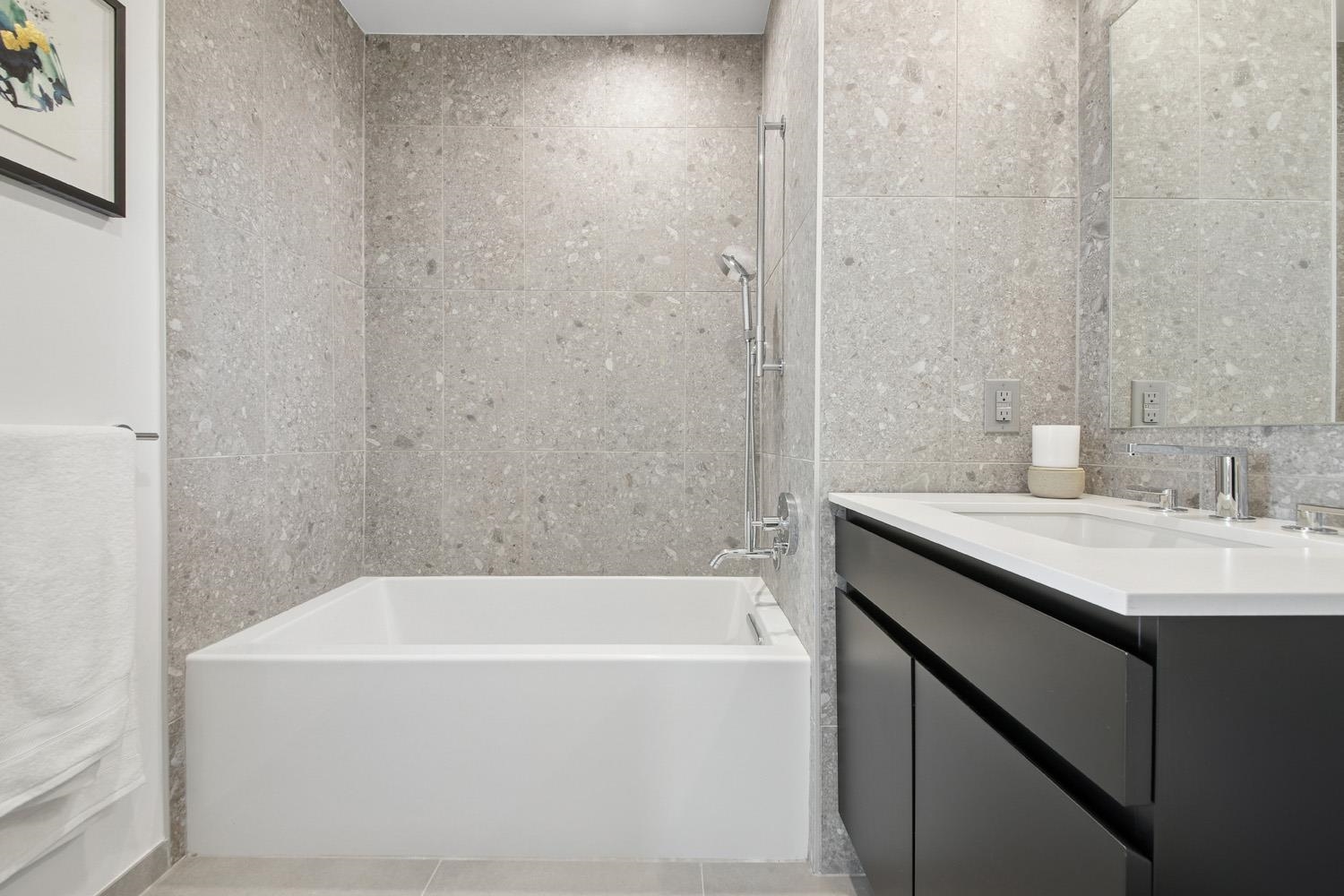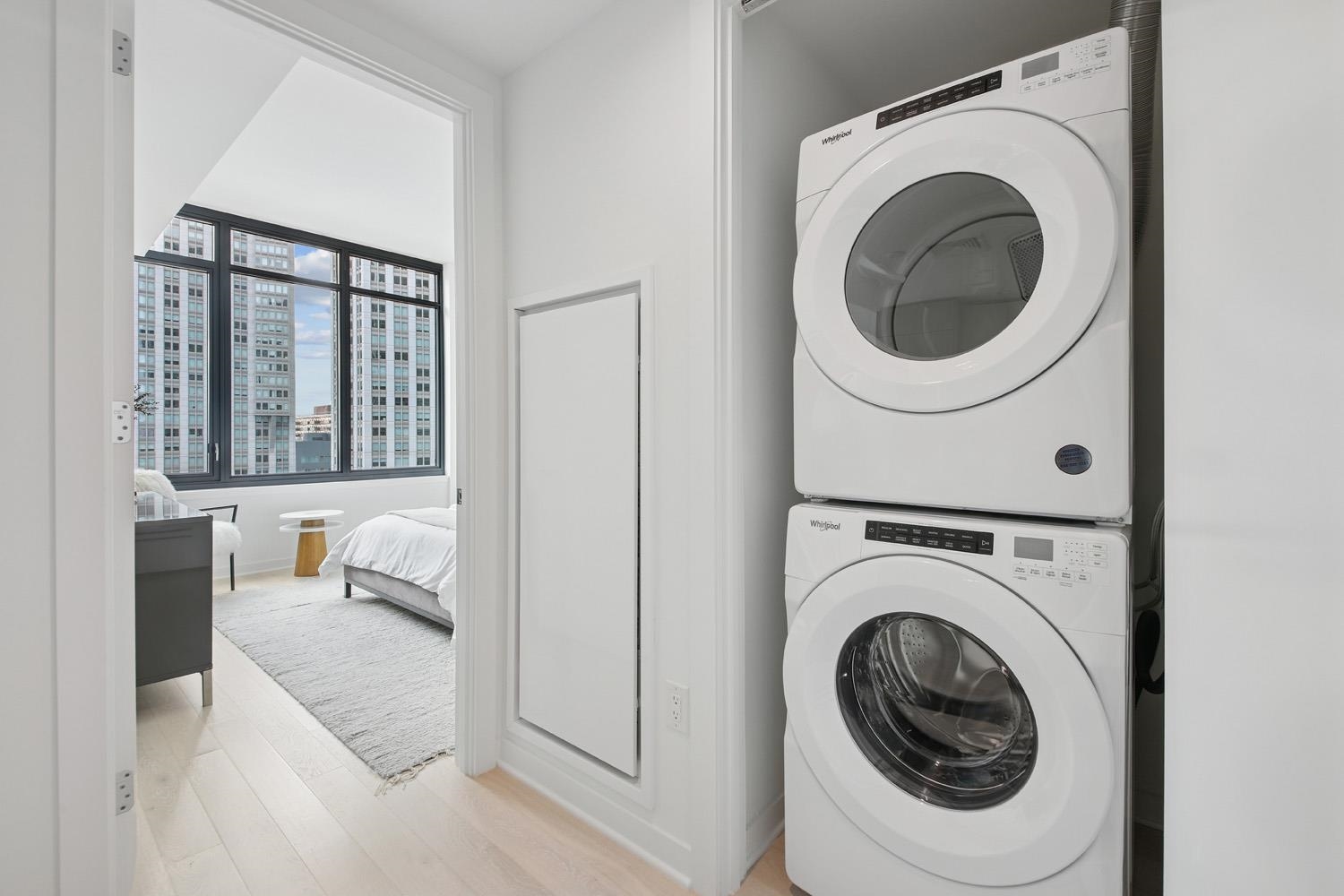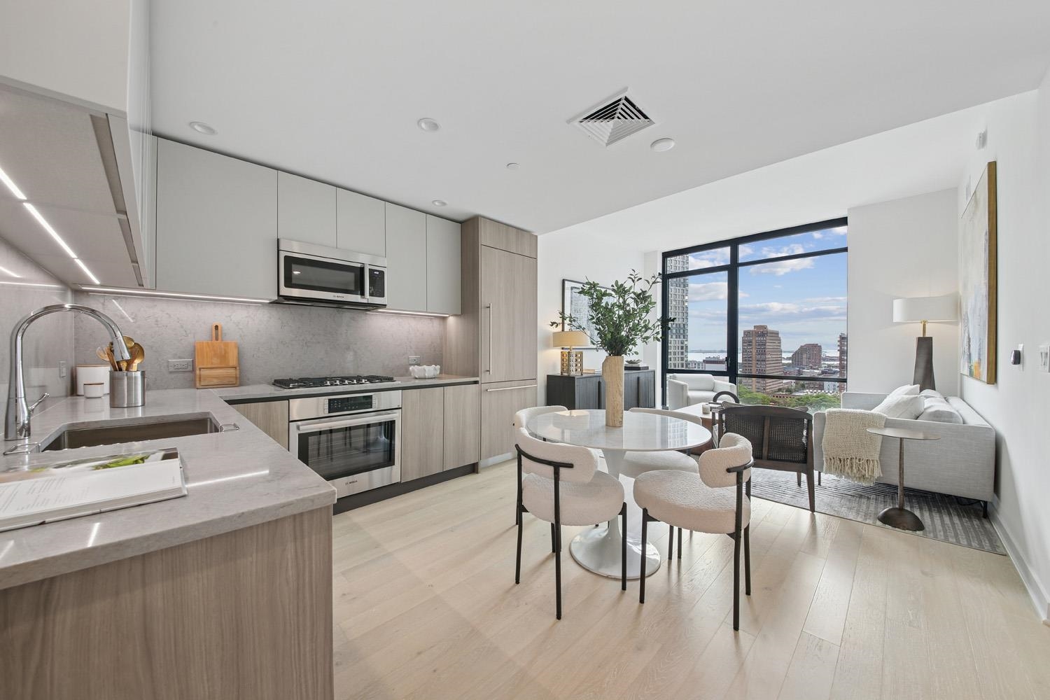 Experience elevated urban living in Residence 1605, nestled in Jersey City's vibrant Powerhouse Arts District. This meticulously designed 721 sq. ft. 1 bedroom offers a harmonious blend of form and function. Floor to ceiling south-facing windows bathe the space in natural light, highlighting the sleek, minimalist design characterized by mixed material finishes and white oak flooring. This building features 259 residences distributed over 34 floors, offering an array of options, including studio, one-bedroom, two-bedroom, two-bedroom with den, and three-bedroom layouts. The open-concept kitchen seamlessly integrates with the living area, featuring custom Italian walnut and dove gray cabinetry, quartz countertops, and Bosch appliances. The spa-inspired bathroom features a single custom vanity, Kohler fixtures, and a soaking tub with porcelain tile surround, offering a serene, modern retreat. Additional highlights include a vented Whirlpool washer and dryer and 1 deeded parking space. Residents enjoy access to world-class amenities, including a sky lounge, rooftop terrace, fitness center, sundeck and pool, residents' lounge, children's playroom, dog run and spa, and a 24-hour attended lobby. Located just moments from the Grove Street PATH station, this residence offers unparalleled convenience and sophistication.