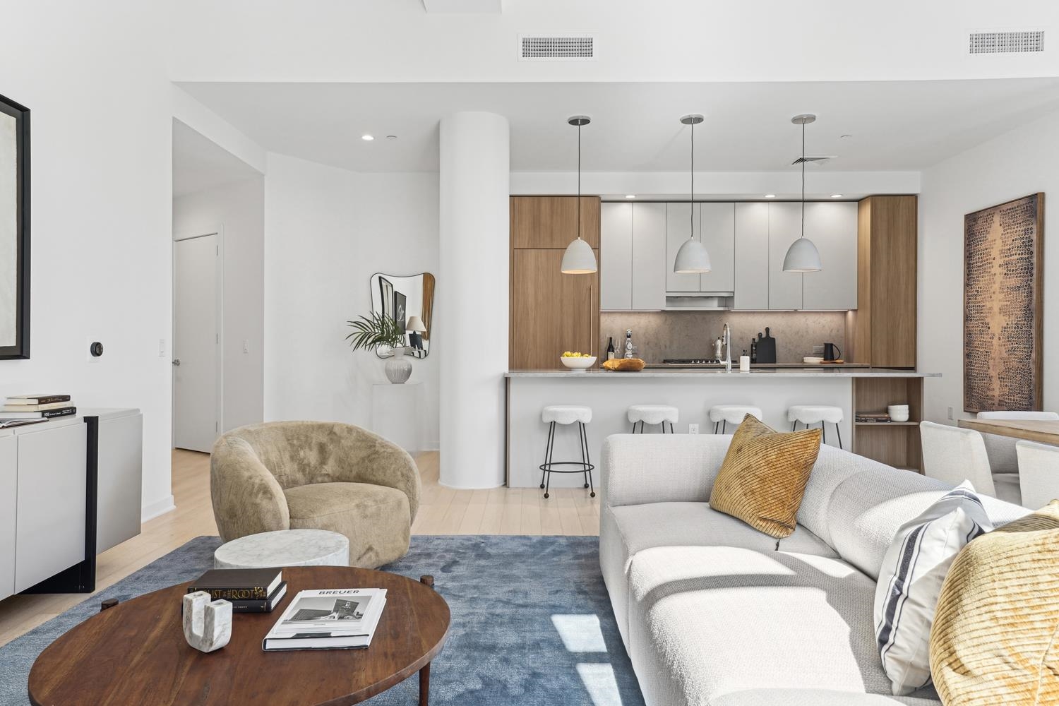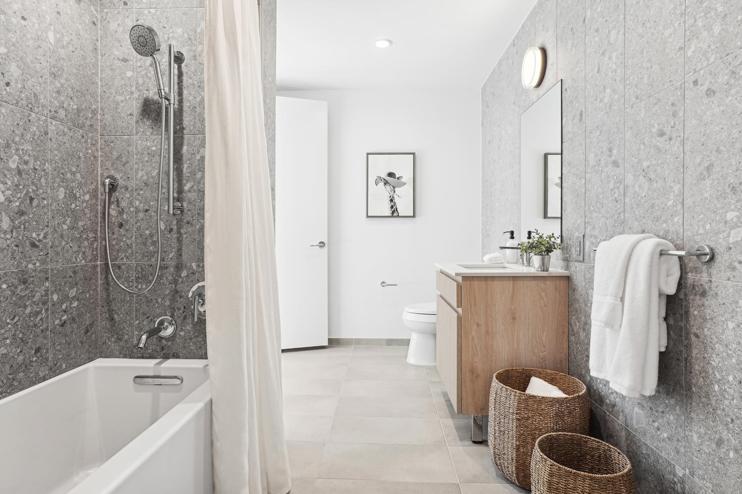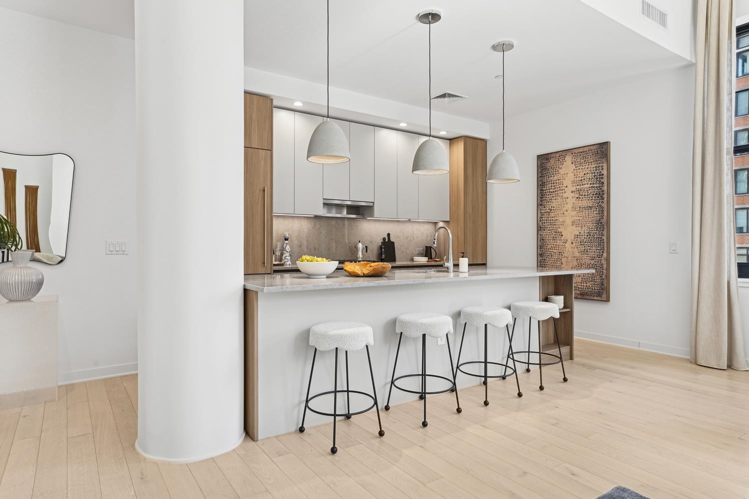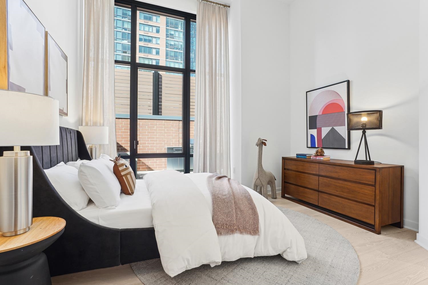 Experience elevated urban living in Residence 809, nestled in Jersey City’s vibrant Powerhouse Arts District. This thoughtfully designed 2,382 sq. ft., three-bedroom + den home blends modern form with refined function. North-facing windows bring in soft, consistent natural light, highlighting the sleek, minimalist design and white oak flooring. This home offers 13 ft. ceilings, a large walk-in closet, and ample kitchen storage and cabinet space, as well as a 710 sq. ft. terrace. The open-concept gourmet kitchen seamlessly integrates with the living area, featuring custom Italian walnut and dove gray cabinetry, quartz countertops, and Bosch and Thermador appliances. The kitchen is a true chef's dream, designed to cater to both casual living and refined entertaining. The primary suite offers an unparalleled retreat, featuring a large walk-in closet and a spa-inspired ensuite with dual custom vanities, Kohler fixtures, and refined porcelain tile accents. The 2nd bathroom features a single custom vanity, Kohler fixtures, and a soaking tub with porcelain tile surround, offering a serene space. Additional highlights include a Whirlpool washer and vented dryer and 1 deeded parking space. Residents enjoy access to world-class amenities, including a sky lounge, rooftop terrace, fitness center, sundeck and pool, residents' lounge, children's playroom, dog run and spa, and a 24-hour attended lobby. Located just moments from the Grove Street PATH station, this residence offers unparalleled convenience and sophistication. This building features 259 residences distributed over 34 floors, offering an array of options, including studio, one-bedroom, two-bedroom, two-bedroom with den, and three-bedroom layouts.