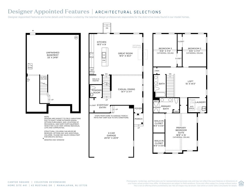 Traditional touches beautifully complement the Coleston’s modern open floor plan. An intimate foyer immediately opens onto the casual dining area and airy great room. The well-designed kitchen offers rear yard access and is complete with a spacious center island with breakfast bar, plenty of counter and cabinet space, and a sizable walk-in pantry. The alluring primary bedroom suite is enhanced by an elegant cathedral ceiling, dual walk-in closets, and a serene primary bath with a dual-sink vanity, a luxe shower with seat, and linen storage. Punctuated by cathedral ceilings, secondary bedrooms offer roomy closets and share a hall bath with a dual-sink vanity. Additional highlights include a spacious loft, conveniently located second-floor laundry, a powder room off the everyday entry, and ample extra storage.