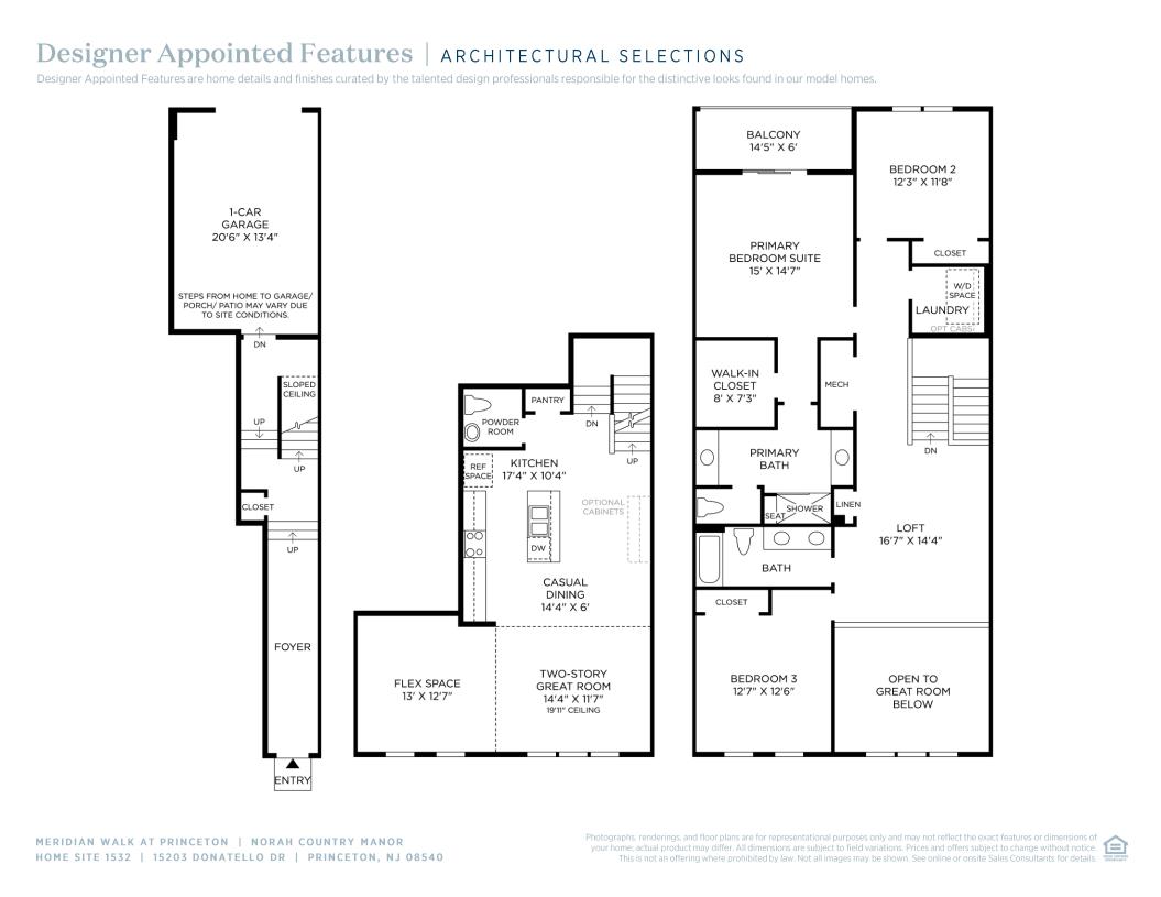 Featuring a desirable multi-level floor plan, the Norah perfectly complements every lifestyle. Accessed from a welcoming entry-level foyer, the spacious main living level reveals a soaring two-story great room open to a large flex room, a cozy casual dining area, and the well-equipped kitchen complete with a sizable pantry cabinet as well as plenty of counter and cabinet space that surrounds an oversized center island with breakfast bar. An alluring private balcony highlights the serene primary bedroom suite that features an ample walk-in closet and a spa-like primary bath with dual vanities, a large luxe shower with seat, and a private water closet. Overlooking a versatile loft space, secondary bedrooms share a hall bath with a dual-sink vanity and feature roomy closets. The beautiful Norah also offers easily accessible bedroom-level laundry, a convenient living-level powder room, and additional storage throughout.