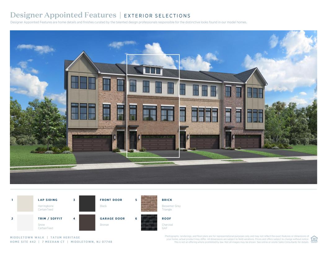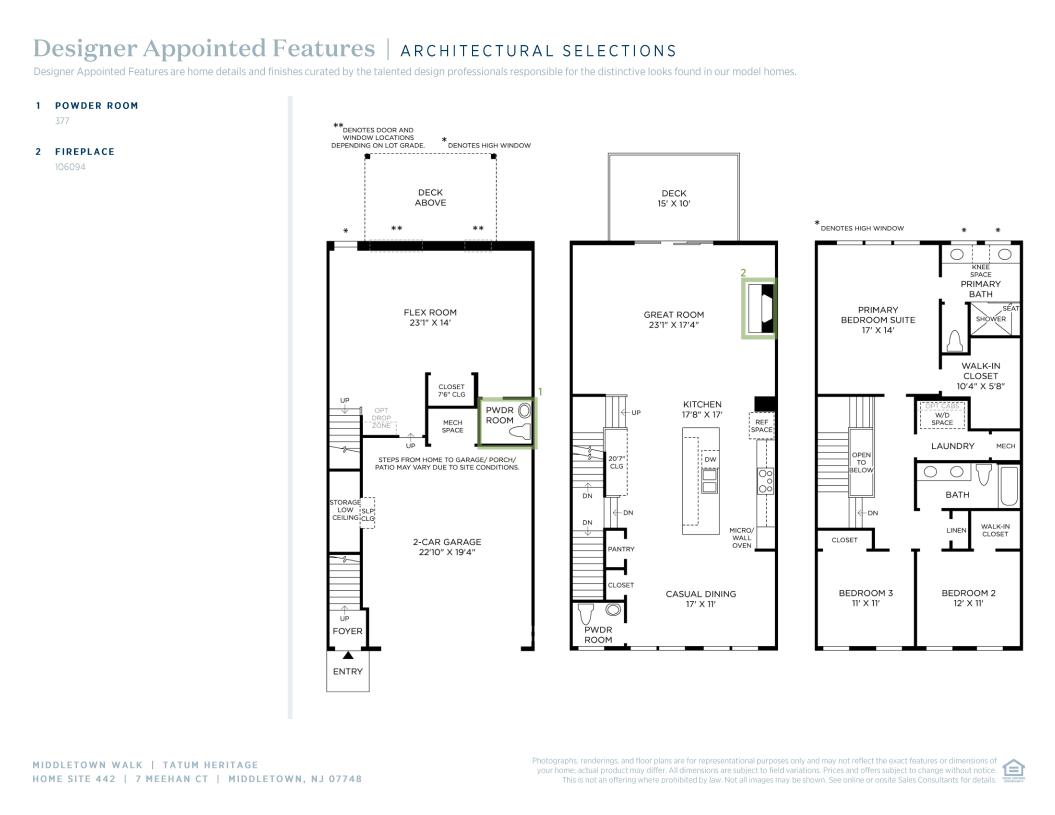 The Tatum's welcoming entry and foyer flow up the inviting stairs to the second floor main living level, revealing the spacious great room with desirable large deck beyond. The well-designed kitchen overlooks a bright casual dining area, and is enhanced by a large center island with breakfast bar, plenty of counter and cabinet space, and roomy pantry. On the third floor, the charming primary bedroom suite is complete with a massive walk-in closet and spa-like primary bath with dual-sink vanity, large luxe shower with seat, and private water closet. Secondary bedrooms feature ample closets and shared hall bath with dual-sink vanity. Additional highlights include a sizable flex room with rear yard access on the first floor, convenient powder room on the second floor, centrally located laundry on the third floor, and additional storage throughout.