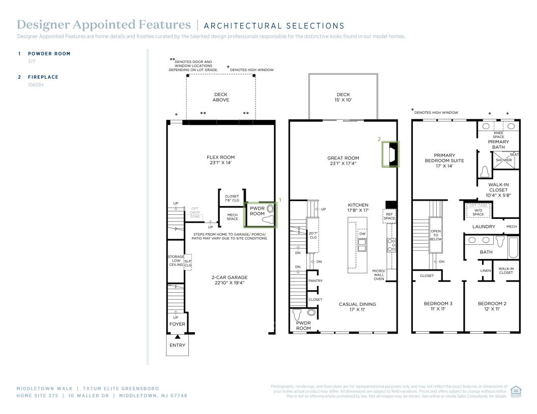 The Tatum Elite's inviting entryway and foyer flow up the welcoming stairs to the second floor main living level, opening to the expansive great room with desirable large deck. The well-appointed kitchen overlooks a bright casual dining area, and is complete with a large center island with breakfast bar, plenty of counter and cabinet space, and sizable pantry. On the third floor, the superb primary bedroom suite is enhanced by a stunning walk-in closet and spa-like primary bath with dual-sink vanity, large luxe shower with seat, and private water closet. Secondary bedrooms feature roomy closets and shared hall bath with dual-sink vanity. Additional highlights include a spacious flex room with rear yard access on the first floor, convenient powder room on the second floor, centrally located laundry on the third floor, and additional storage throughout.