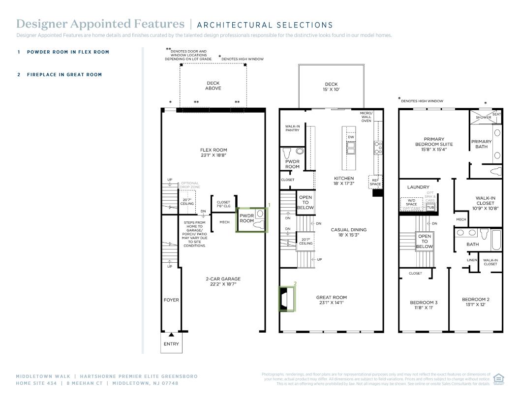 The Hartshorne Premier Elite embodies comfort and luxury across a thoughtfully designed three story floor plan. The main living level opens to a stunning great room, a casual dining area, and an open gourmet kitchen. The well-appointed kitchen features a large center island with a breakfast bar, a generous walk-in pantry, and access to a deck for seamless indoor-outdoor entertaining. The bedroom level includes a luxurious primary bedroom suite with a spacious walk-in closet and a spa-like bath with a dual-sink vanity, a soothing shower, and a private water closet. Two secondary bedrooms provide ample closet space and access to a full hall bath, ideal for family or guests. Other highlights include a versatile flex room, a second-floor powder room, and an expansive two-car garage with additional storage.