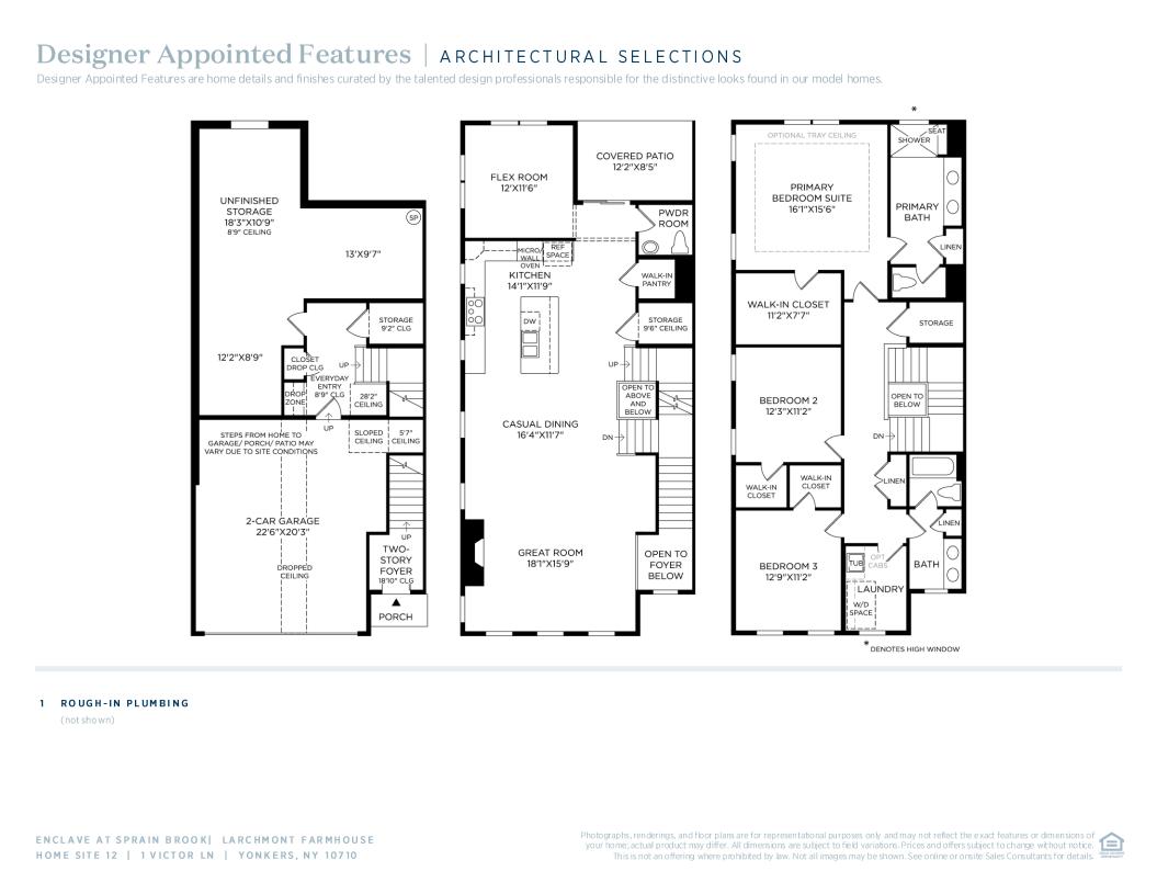 The Larchmont maximizes space and comfort. A two-story foyer leads to stairs to the second floor, where guests are immediately greeted by an inviting great room accentuated by a cozy fireplace. The kitchen is outfitted with a large island for ample counter space, a walk-in pantry, and a casual dining area. A flex room provides versatile living options for a variety of lifestyles. On the upper level lies the primary suite, complete with a walk-in closet and a serene bath offering a shower with a seat, a dual-sink vanity, and a private water closet. Secondary bedrooms include walk-in closets and share a full hall bath with a separate vanity area. Other highlights include a lovely covered patio, a large unfinished storage area, a powder room, and an everyday entry.
