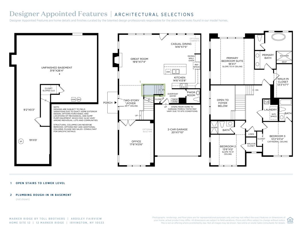 The elegant Ardsley is enhanced by beautiful architectural details, starting with an inviting two-story foyer. A spacious great room featuring a cozy fireplace is open to a bright casual dining area with outdoor access and a well-equipped kitchen offering a large center island with breakfast bar and plenty of counter and cabinet space. Retreat to the airy primary bedroom, complete with a chic sloped ceiling, a generous walk-in closet, and a serene primary bath with a relaxing soaking tub, a luxe shower with seat, a dual-sink vanity and a private water closet. Secondary bedrooms, one with a walk-in closet, are highlighted by lovely ceiling details and private baths. Other highlights include an everyday entry with drop zone, a versatile office, a first-floor powder room, and bedroom-level laundry.