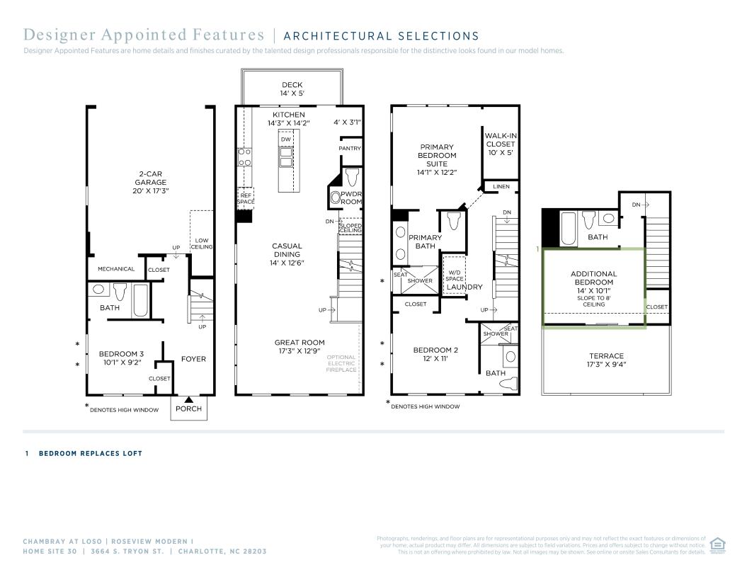 The Roseview beautifully combines contemporary luxury with practicality. An inviting foyer reveals a secluded secondary bedroom with a private bath and stairs leading to the main living level. The great room extends seamlessly into the casual dining area, creating an ideal space for gathering. Adjacent, the well-equipped kitchen features a spacious center island with breakfast bar, ample cabinet and counter space, and a useful pantry, as well as access to a lovely deck. A lovely primary bedroom features a generous walk-in closet and a relaxing primary bath complete with a dual-sink vanity, a luxe shower with seat, and private water closet. A secondary bedroom offers an ample closet and a desirable private bath. On the fourth floor is a beautiful loft, an additional full bath, and a breathtaking terrace perfect for entertaining. Other highlights include an everyday entry, a first-floor powder room, bedroom-level laundry, and extra storage space throughout.