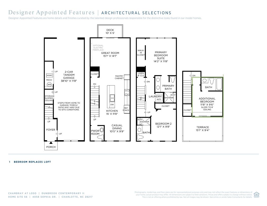 The Dunbrook features a beautiful blend of luxurious living spaces ideal for relaxing and entertaining. An inviting foyer leads up to the main living level, highlighted by a cozy casual dining area and a spacious great room with direct access to an outdoor deck. The well-equipped kitchen boasts abundant counter and cabinet space as well as a center island with breakfast bar, ideal for effortless entertaining. Upstairs, the lush primary bedroom suite is enhanced with a large walk-in closet and a tranquil primary bath that includes dual sinks, a luxe shower with seat, and a private water closet. Adjacent, the secondary bedroom comes with a roomy closet and private bath. A versatile loft can be found on the fourth floor, featuring a full bath, closet space, and access to an outdoor terrace. Additional features of the Dunbrook include a powder room on the main living level, bedroom-level laundry, and extra storage throughout the home.