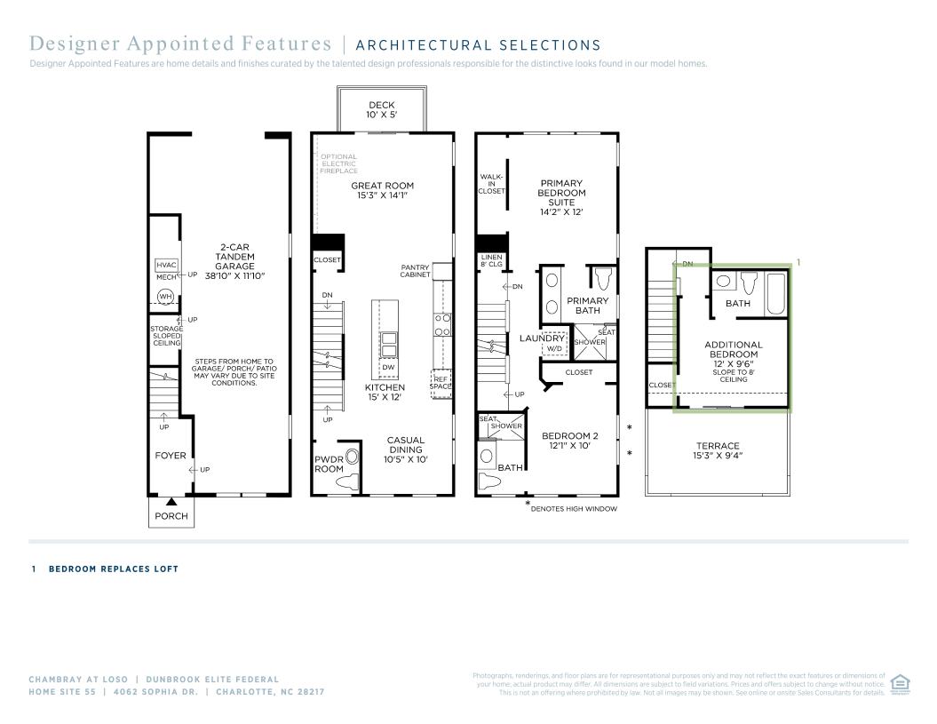 The Dunbrook Elite provides luxurious living spaces throughout a stunning four-story floor plan. Enter through a cozy foyer that leads up to the main living level, highlighted by a spacious great room with direct access to an outdoor deck. Overlooking a casual dining space, the kitchen is well-designed, boasting ample counter and cabinet space as well as a large center island with an attached breakfast bar. Secluded on the third floor is the elegant primary bedroom suite, enhanced with a walk-in closet and a spa-inspired primary bath featuring a dual-sink vanity, luxe shower with seat, and a private water closet. The secondary bedroom is sizable, offering a roomy closet and a private bath. A beautiful loft can be found on the fourth floor, along with a full bath, closet space, and an expansive outdoor terrace. The Dunbrook Elite also includes bedroom-level laundry, a convenient powder room on the main living level, and ample storage space throughout the home.