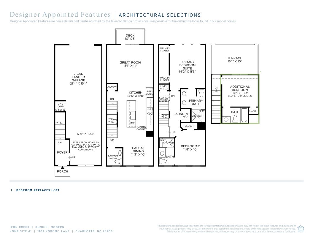 The Dunhill is an exceptional townhome designed for comfortable living and easy entertaining. A charming foyer and stairs lead up to the second floor that features a well-equipped kitchen overlooking the spacious great room and casual dining area. On the third floor, the secluded primary suite boasts a walk-in closet and a spa-like primary bath with dual-sink vanity and luxe glass shower with seat. An adjacent secondary bedroom offers a private bath and roomy closet. A versatile loft on the fourth floor provides access to a rooftop terrace, with additional including convenient bedroom level laundry, a powder room on the main living level, and desirable additional storage throughout.
