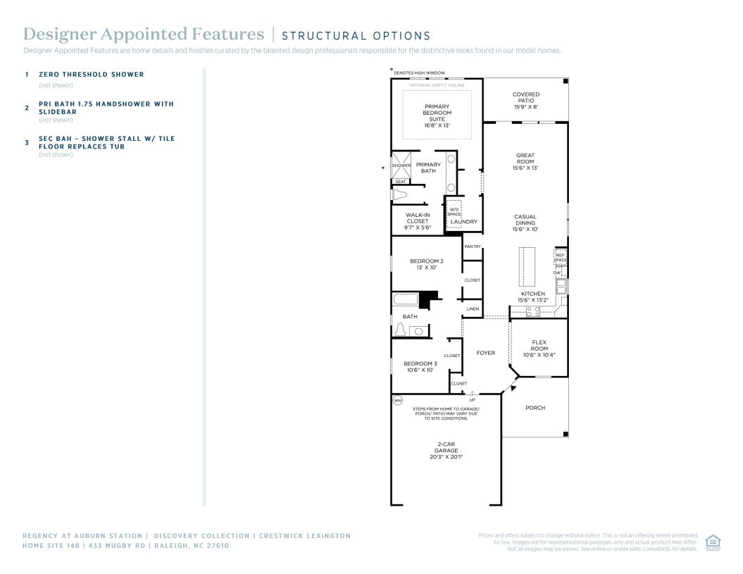 The beautifully crafted Crestwick leaves a lasting impression with a spacious foyer and flex room revealing a gorgeous great room that is central to a casual dining area and the desirable rear covered patio. Adjacent, the well-designed kitchen is complete with a large center island with breakfast bar, wraparound counter and cabinet space, and a roomy walk-in pantry. Complementing the beautiful primary bedroom suite is a sizable walk-in closet and a spa-like primary bath with a dual-sink vanity, a large luxe shower with seat, and a private water closet. Secondary bedrooms, one with a walk-in closet, are spacious and share a full hall bath. Additional highlights include easily accessible laundry and plenty of additional storage.