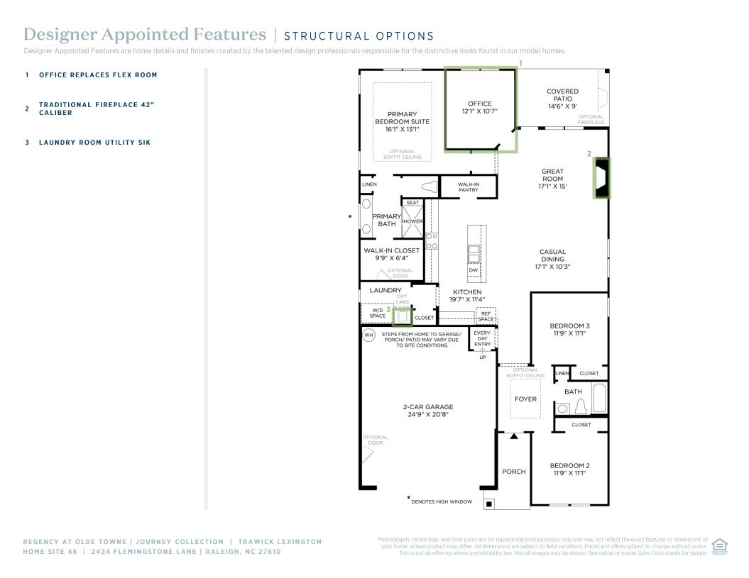 With the kitchen at the heart of the home, the Trawick leaves a lovely impression. The splendid great room and casual dining area are central to the bright foyer, desirable covered patio, and well-designed kitchen offering a large center island with breakfast bar, plenty of counter and cabinet space, and a sizable walk-in pantry. Defining the secluded primary bedroom suite are a spacious walk-in closet and a splendid primary bath with a dual-sink vanity, a large luxe shower with seat, linen storage, and a private water closet. Secondary bedrooms feature ample closets and shared hall bath. Additional highlights include a generous flex room, a convenient everyday entry, an easily-accessible laundry, and plenty of additional storage.
