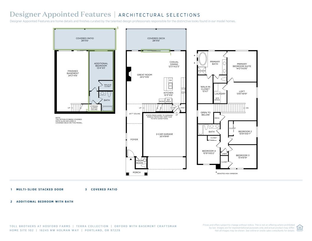 The Orford with Basement's airy foyer reveals an expansive great room with rear patio, and bright casual dining area overlooked by the well-appointed kitchen offering a large center island with breakfast bar, plenty of counter and cabinet space, and sizable pantry. The stunning primary bedroom suite is defined by a generous walk-in closet and impressive primary bath with dual-sink vanity, large soaking tub, luxe shower, and private water closet. Adjacent to a sizable loft, secondary bedrooms feature ample closets and shared hall bath with dual-sink vanity. Additional highlights include a spacious finished basement with covered patio, convenient powder room, centrally located laundry, and additional storage throughout.