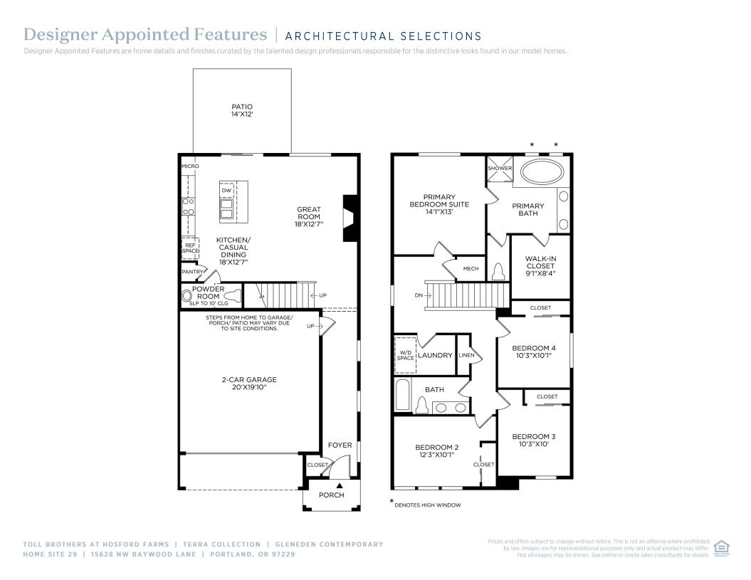 The Gleneden's beautiful living level features a spacious great room and casual dining area central to the desirable large rear patio and overlooked by the well-appointed kitchen offering a large center island with breakfast bar, plenty of counter and cabinet space, and roomy pantry. The deluxe primary bedroom suite is highlighted by a generous walk-in closet and marvelous primary bath with dual-sink vanity, large soaking tub, luxe shower, and private water closet. The sizable secondary bedrooms feature large closets and shared hall bath with a dual-sink vanity. Additional highlights include a convenient powder room, a centrally located laundry, and plenty of additional storage.