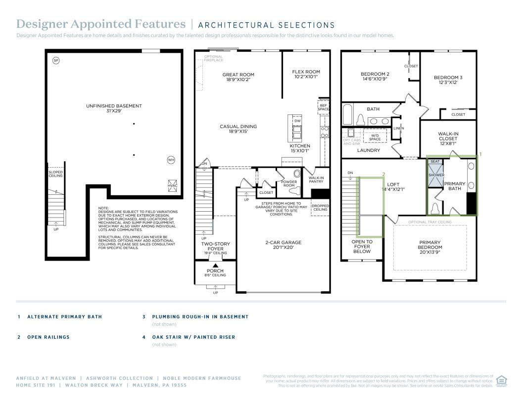 The Noble home design offers flexibility and comfort within an open-concept floor plan. A stunning foyer welcomes you into the home, leading into the expansive great room, casual dining area, and adjacent flex room. Overlooking the main living space is the well-designed kitchen, enhanced by a walk-in pantry, large center island, and ample counter and cabinet space. The elegant primary bedroom suite is tucked away on the second floor, featuring a sizable walk-in closet and spa-like primary bath that offers dual sinks, a large shower, and private water closet. The second floor is enhanced by a spacious loft that provides additional living space and is central to the secondary bedrooms as well as a hall bath. The Noble is also highlighted by easily accessible second-floor laundry, a powder room, and plenty of additional storage.