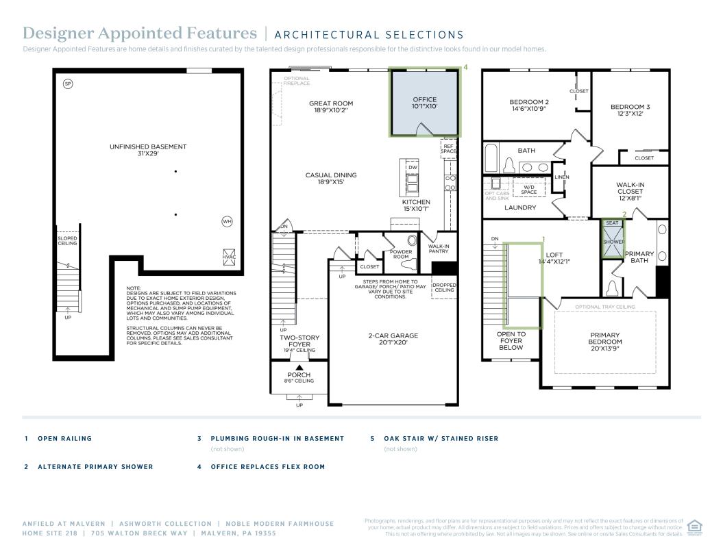 The Noble home design offers flexibility and comfort within an open-concept floor plan. A stunning foyer welcomes you into the home, leading into the expansive great room, casual dining area, and adjacent flex room. Overlooking the main living space is the well-designed kitchen, enhanced by a walk-in pantry, large center island, and ample counter and cabinet space. The elegant primary bedroom suite is tucked away on the second floor, featuring a sizable walk-in closet and spa-like primary bath that offers dual sinks, a large shower, and private water closet. The second floor is enhanced by a spacious loft that provides additional living space and is central to the secondary bedrooms as well as a hall bath. The Noble is also highlighted by easily accessible second-floor laundry, a powder room, and plenty of additional storage.
