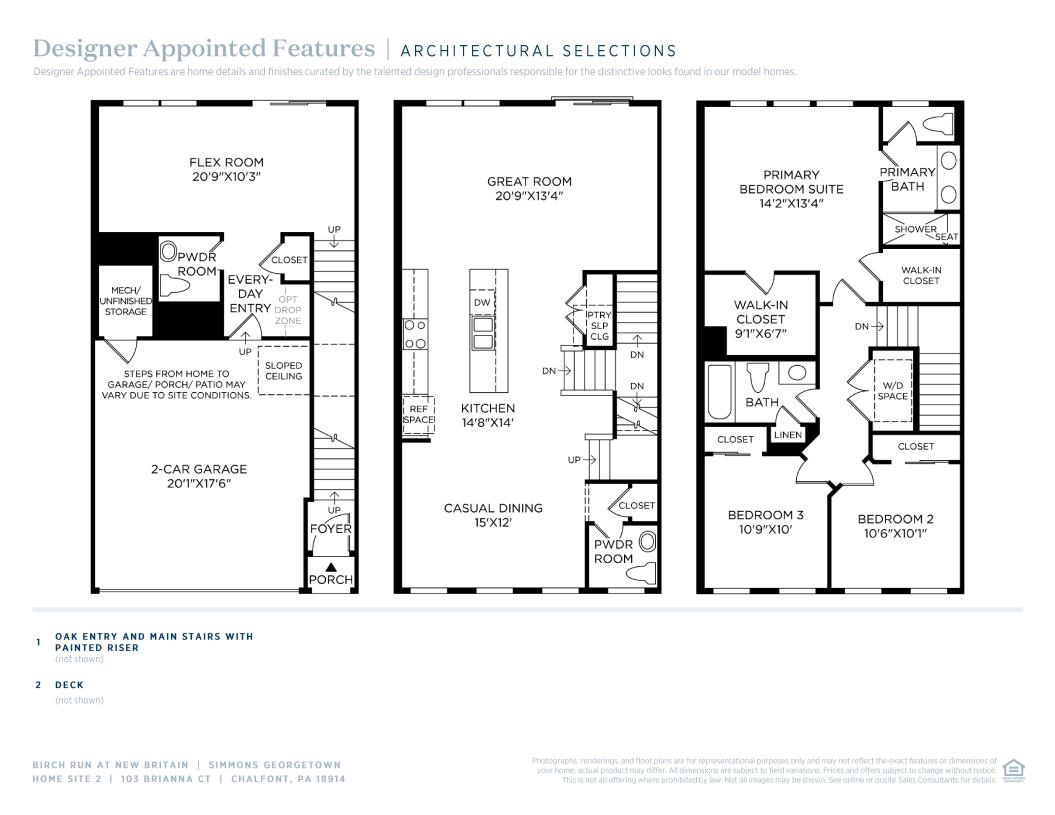 The Simmons offers three thoughtfully arranged levels that balance style and everyday function. A welcoming foyer leads to a versatile flex room, ideal for work or relaxation. The second floor features an open-concept great room, a bright casual dining area, and a well-equipped kitchen with a spacious center island. Located on the third floor, the sophisticated primary bedroom offers dual walk-in closets and a relaxing bath with a dual-sink vanity, a spacious shower with built-in seat, and a private water closet. Two lovely secondary bedrooms share a full hall bath. Additional highlights include an everyday entry, a second-floor powder room, and convenient bedroom-level laundry.