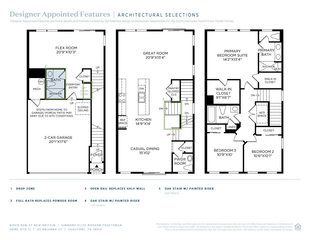 The Simmons Elite offers a thoughtfully designed layout with ample space for everyday living and entertaining. A foyer leads up to the spacious, open-concept main living area, highlighted by a stunning great room. Overlooking a casual dining area, the gourmet kitchen is expertly crafted with plenty of counter and cabinet space and a large center with breakfast bar. The third level features the lavish bedroom primary suite that offers dual walk-in closets and a lush private bath complete with dual sinks, a luxe shower with seat, and a private water closet. Adjacent, you'll find two sizable secondary bedrooms that share a full hall bath. Tucked away on the first floor is a spacious flex room that provides additional living space. Also featured in the Simmons Elite are powder rooms on the first and second floor, a convenient everyday entry, bedroom-level laundry, and added storage throughout.