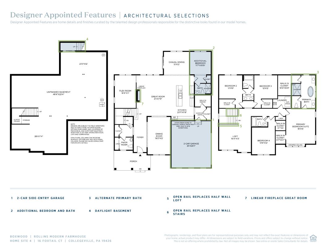 The stunning Rollins features versatile spaces for a modern lifestyle. The airy open floor plan opens with a grand foyer that flows past an elegant dining room into a spacious great room, perfect for hosting gatherings. Adjacent to a bright casual dining area and a useful workspace, the thoughtfully designed kitchen features a large center island with breakfast bar, plentiful cabinet and counter space, and a walk-in pantry. Enjoy the convenience of a main-level flex room ideal for a home office or hobby area, as well as a loft on the second level that can serve as additional living space or a play area. The primary bedroom is a serene retreat offering two walk-in closets and a relaxing primary bath with dual sinks, a luxe shower with seat, and a private water closet. Three roomy secondary bedrooms offer walk-in closets—two share a full bathroom with a separate vanity area, and one shares a full hall bath. Other notable features include a laundry room on the bedroom level, an everyday entry, and a first-floor powder room.
