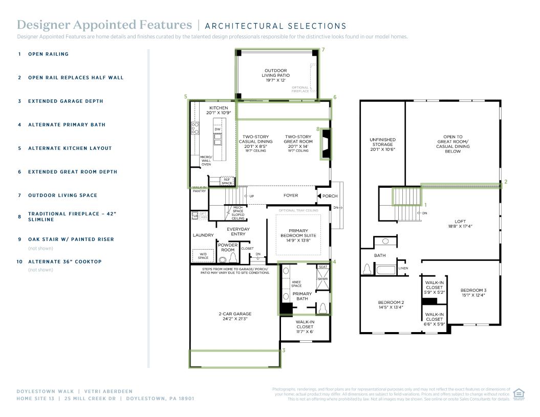 With a first-floor primary bedroom suite and spacious living areas, the Vetri offers an ideal balance for everyday living. The Vetri’s alluring side entryway and foyer open up to the great room, casual dining area, and well-appointed kitchen. A large center island with breakfast bar offers plenty of counter and cabinet space alongside a generous walk-in pantry. The primary bedroom suite is enhanced by a stunning walk-in closet and gracious primary bath with dual-sink vanity and large luxe shower. The second floor is home to a generous loft and secondary bedrooms featuring sizable closets and a shared hall bath. Additional highlights include a convenient powder room and everyday entry, centrally located laundry, and ample unfinished storage.