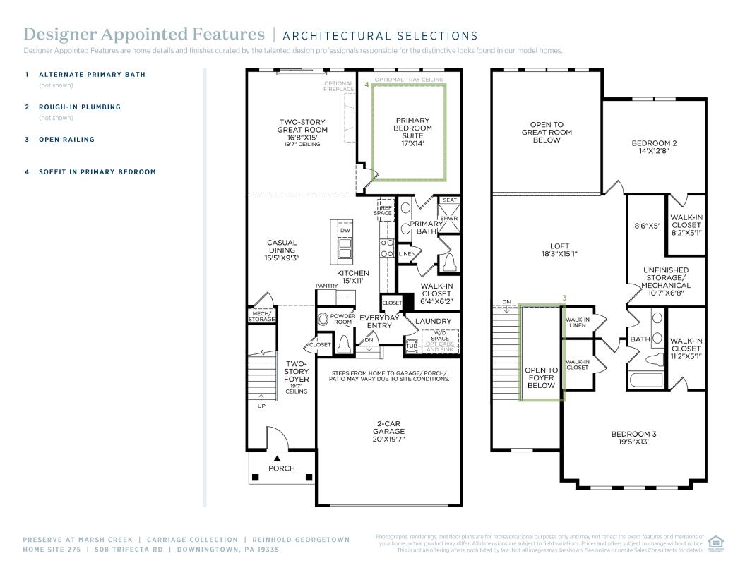 The Reinhold makes a strong impression with soaring spaces and a thoughtful floor plan. Step through the airy two-story foyer into a generous casual dining area that flows seamlessly into an elegant, light-filled great room with rear yard access. The well-appointed kitchen is complete with an oversized center island with breakfast bar, plenty of counter and cabinet space, and a pantry. Complementing the lovely primary bedroom suite is a roomy walk-in closet and a beautiful primary bath with a dual-sink vanity, a luxe shower with seat, linen storage, and a private water closet. A generous loft on the second floor offers many living and entertaining possibilities. Secondary bedrooms, one with a walk-in closet, the other with dual walk-in closets, share a hall bath with a dual-sink vanity. Additional highlights include easily accessible laundry off the everyday entry, a powder room, and additional storage throughout.