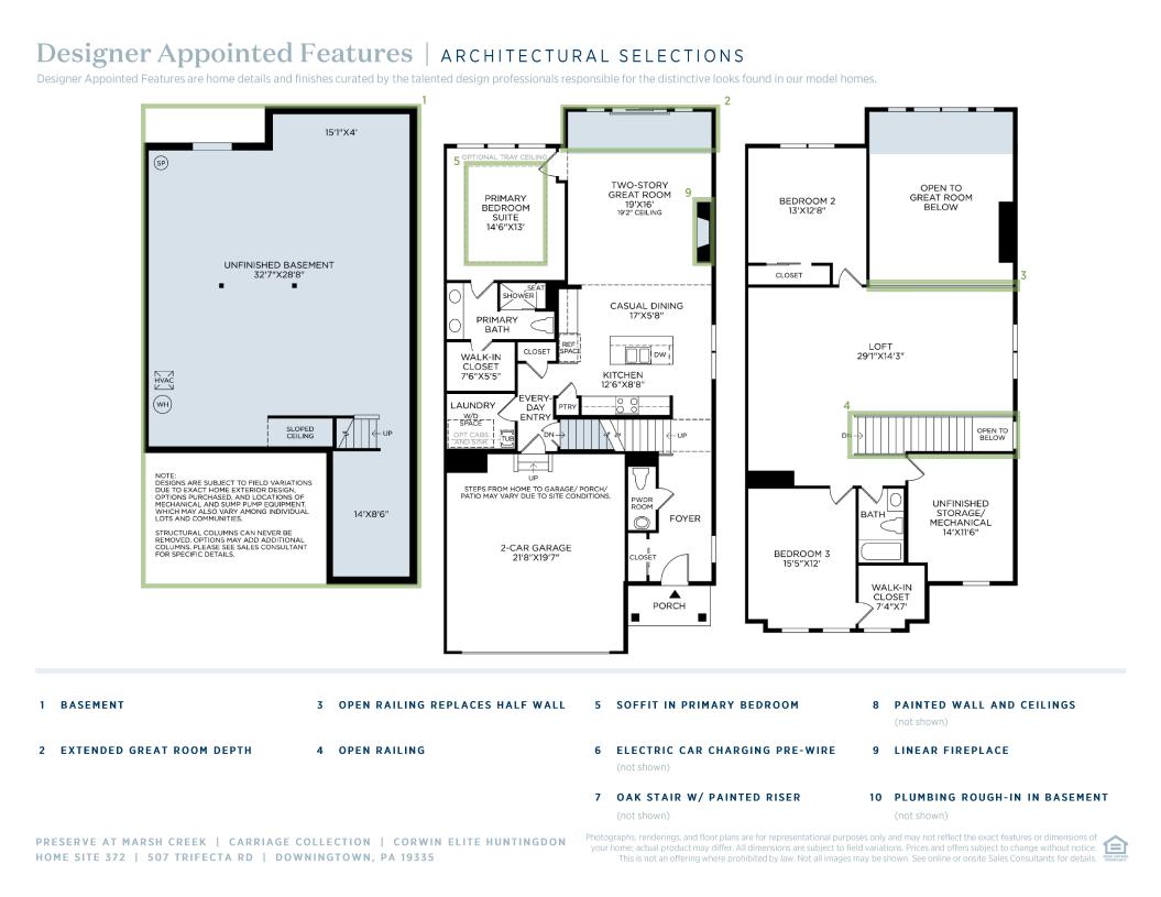 The Corwin Elite blends sophistication and comfort in its lovely design. The home opens with an intimate foyer that flows into a spacious casual dining area and a stunning two-story great room with rear yard access. The well-appointed kitchen is enhanced by an oversized center island with breakfast bar, plenty of counter and cabinet space, and an ample pantry. The charming primary bedroom suite is highlighted by a sizable walk-in closet and a deluxe primary bath with a dual-sink vanity, a large luxe shower with seat, and a private water closet. On the second floor, an expansive loft offers exciting living and entertaining possibilities. Secondary bedrooms, one with a roomy closet, the other with a walk-in closet, share a full hall bath. Additional highlights include conveniently located laundry, a powder room, an everyday entry, and plenty of additional storage.
