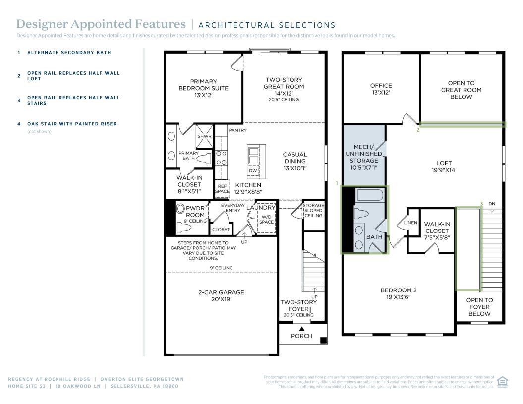 The Overton Elite offers a stunning layout with a modern and stylish design. Upon entering, you're greeted by an impressive two-story foyer that flows seamlessly into the heart of the home. The first level boasts a spacious, two-story great room that overlooks a casual dining area and the expertly crafted kitchen. The kitchen is enhanced with ample counter and cabinet space and a large center island, ideal for easy entertaining. The primary bedroom suite is secluded on the first floor as well, complete with a sizable walk-in closet and a spa-like private bath featuring dual sinks and a luxe shower. On the second floor, you'll find a generous loft that is central to a flexible office space and a sizable secondary bedroom complete with a walk-in closet and a shared hall bath. Additional features of the home include easily accessible laundry, a powder room, a convenient everyday entry, and plenty of added storage.