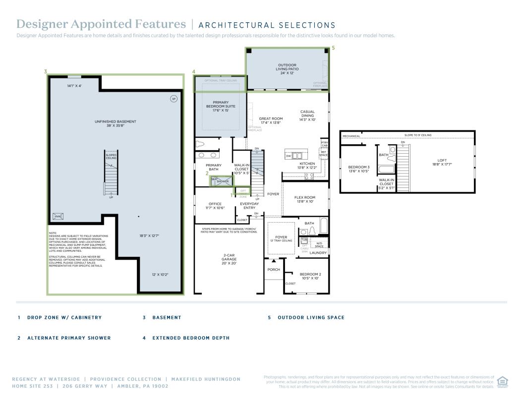 From its impressive foyer with tray ceiling to its open main living area overlooking the rear yard to its private primary bedroom retreat, the Makefield is a joy to call home. Just beyond the bright flex room lies an expansive great room and casual dining area with desirable access to the rear yard. The kitchen features a large center island with breakfast bar, wraparound counter and cabinet space, and ample pantry storage. Complementing the superb primary bedroom suite are a spacious walk-in closet and splendid primary bath with dual-sink vanity, large luxe shower with seat, and private water closet. A secluded office set just off the everyday entry, a secondary bedroom with roomy closet and shared hall bath, and a large laundry room complete the first floor. On the second floor, an additional bedroom with walk-in closet overlooks a generous loft.